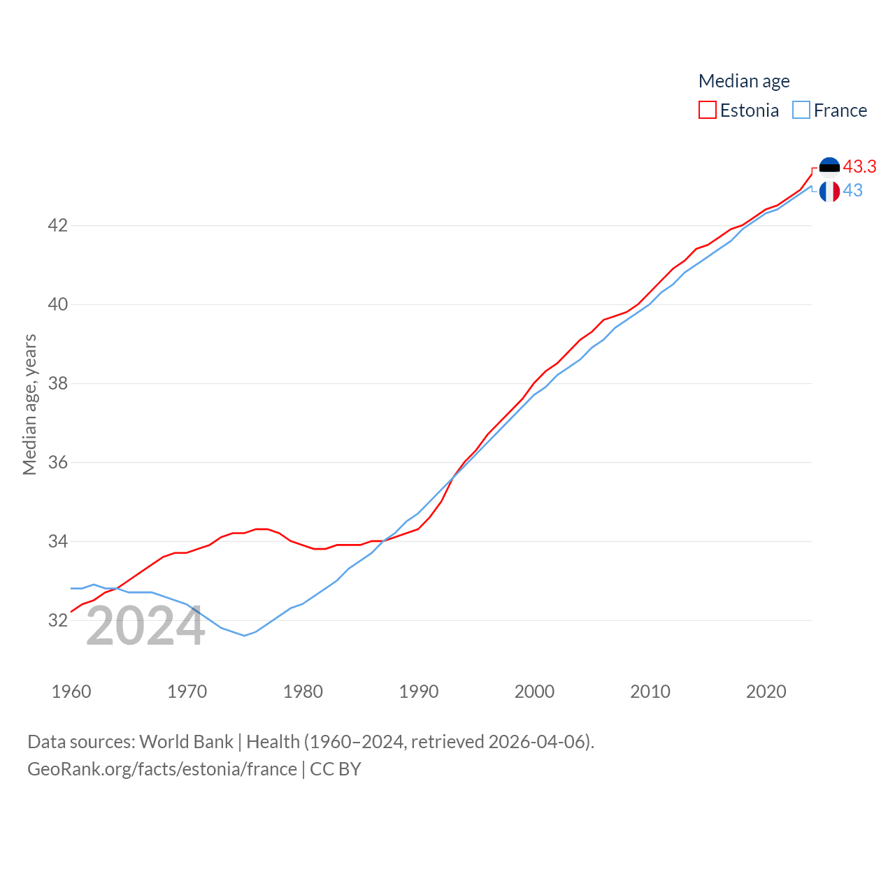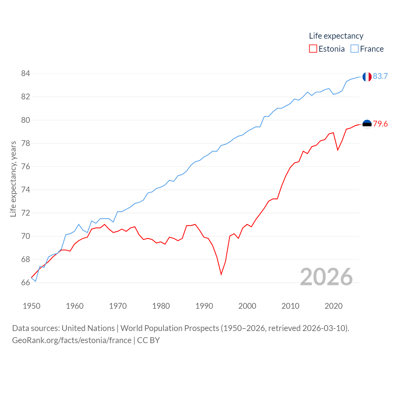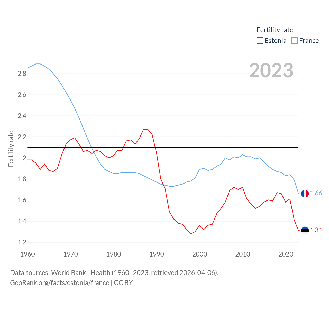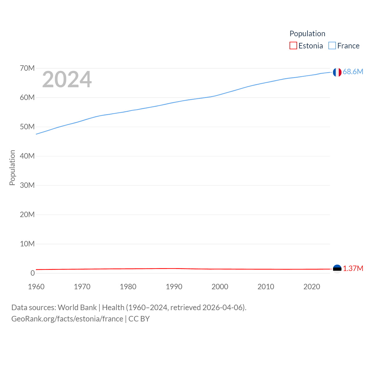 Estonia has a population of 1.37M (ranked 153/197), compared with 68.6M in France (ranked 23/197). Estonia's land area is 16,498 sq mi versus 208,090 sq mi for France (ranked 129th vs. 48th).