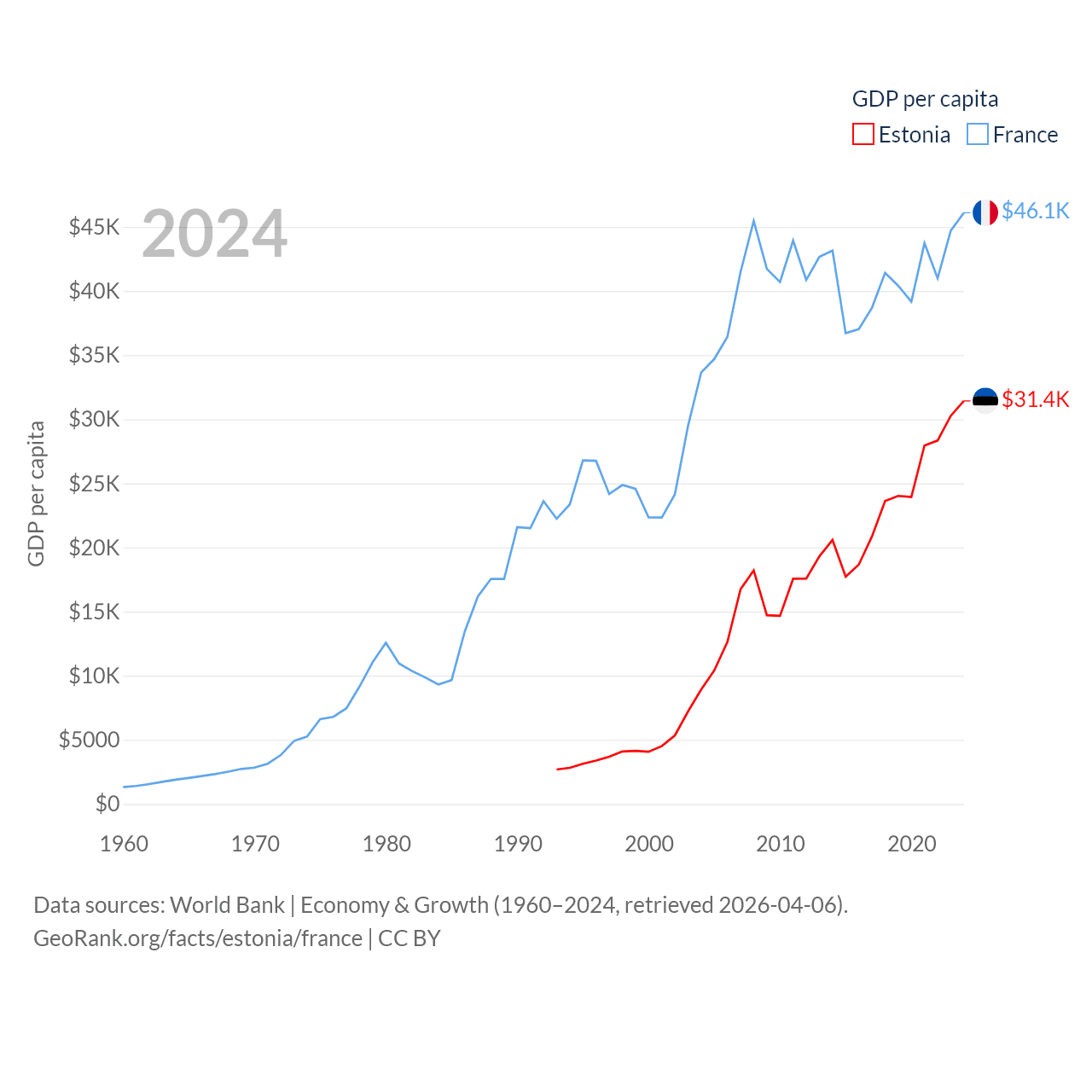 By GDP, Estonia ranks 100/197 ($43.1B) and France ranks 7/197 ($3.16T). By GDP per capita, Estonia ranks 40/197 ($31,428), while France ranks 27/197 ($46,103).