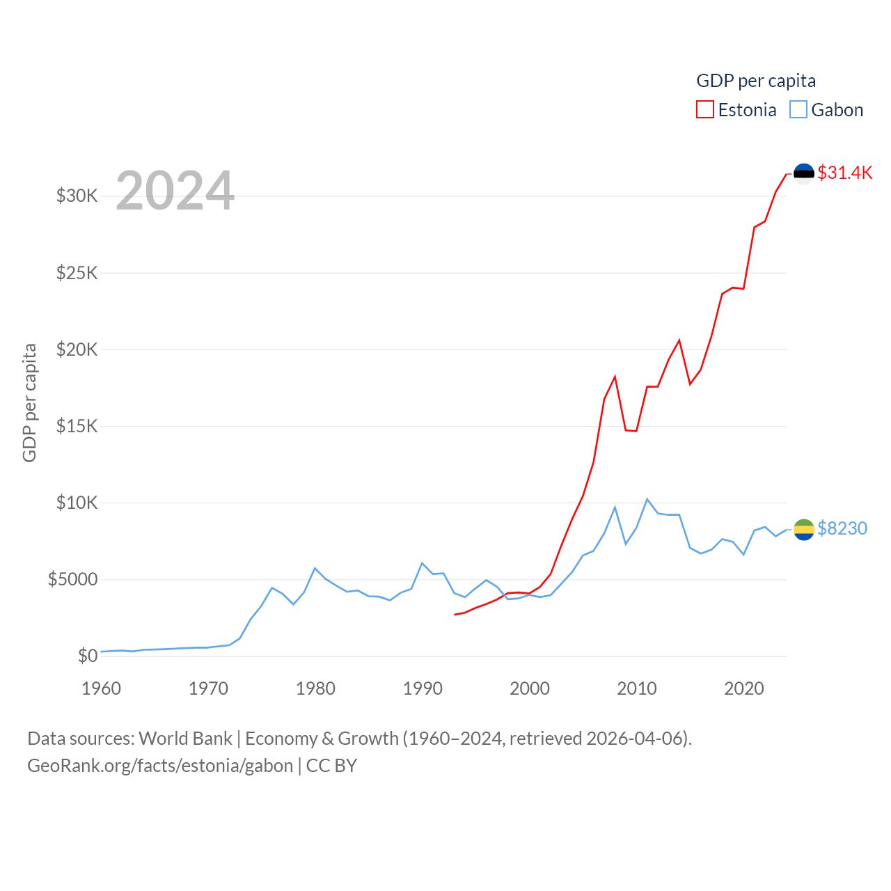 By GDP, Estonia ranks 100/197 ($43.1B) and Gabon ranks 127/197 ($20.9B). By GDP per capita, Estonia ranks 40/197 ($31,428), while Gabon ranks 93/197 ($8,230).