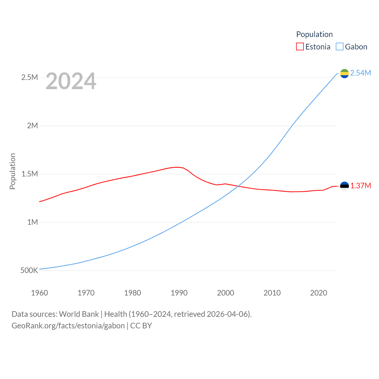 Estonia has a population of 1.37M (ranked 153/197), compared with 2.54M in Gabon (ranked 141/197). Estonia's land area is 16,498 sq mi versus 99,487 sq mi for Gabon (ranked 129th vs. 75th).