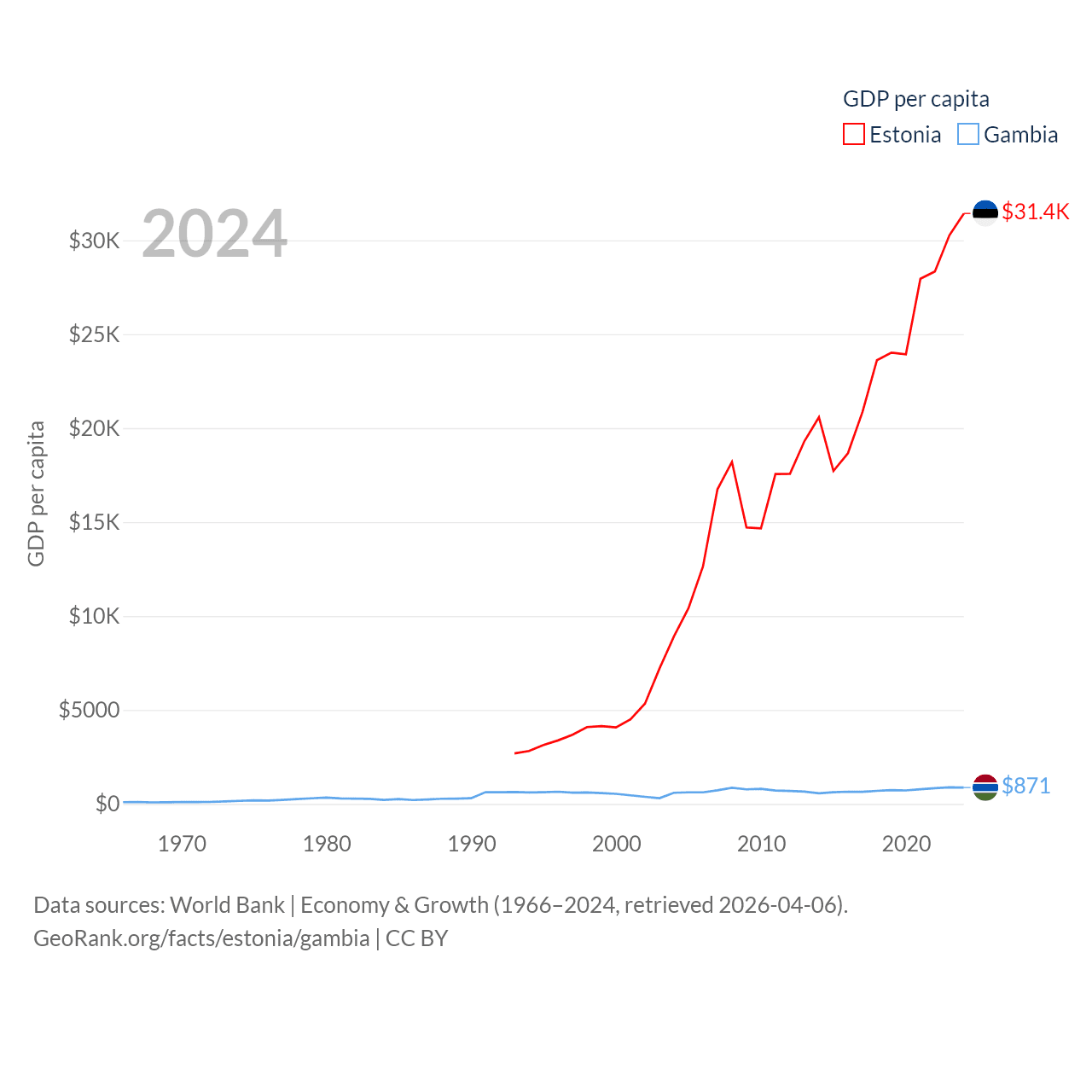 By GDP, Estonia ranks 100/197 ($43.1B) and The Gambia ranks 174/197 ($2.4B). By GDP per capita, Estonia ranks 40/197 ($31,428), while The Gambia ranks 183/197 ($871).