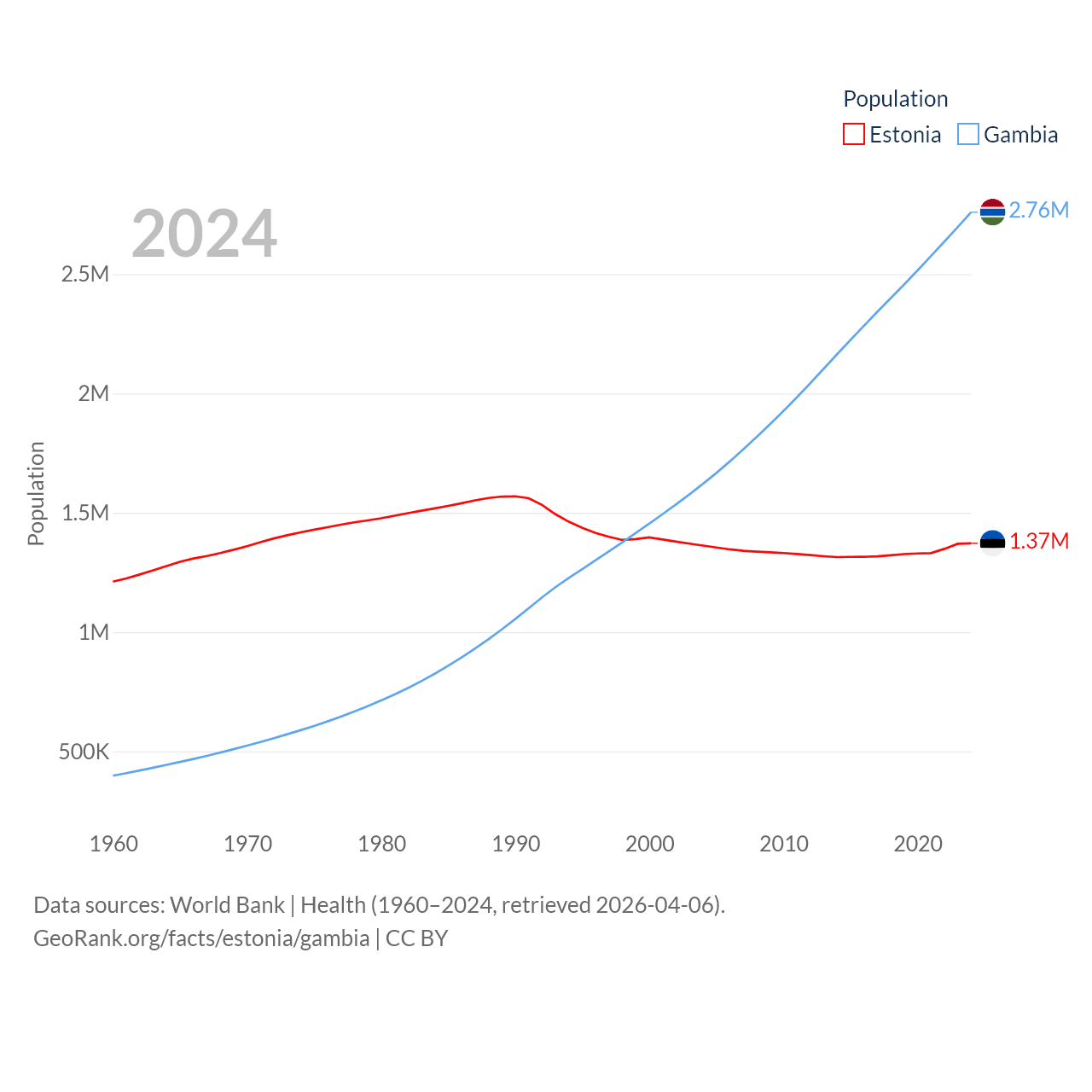 Estonia has a population of 1.37M (ranked 153/197), compared with 2.76M in The Gambia (ranked 140/197). Estonia's land area is 16,498 sq mi versus 3,907 sq mi for The Gambia (ranked 129th vs. 161st).