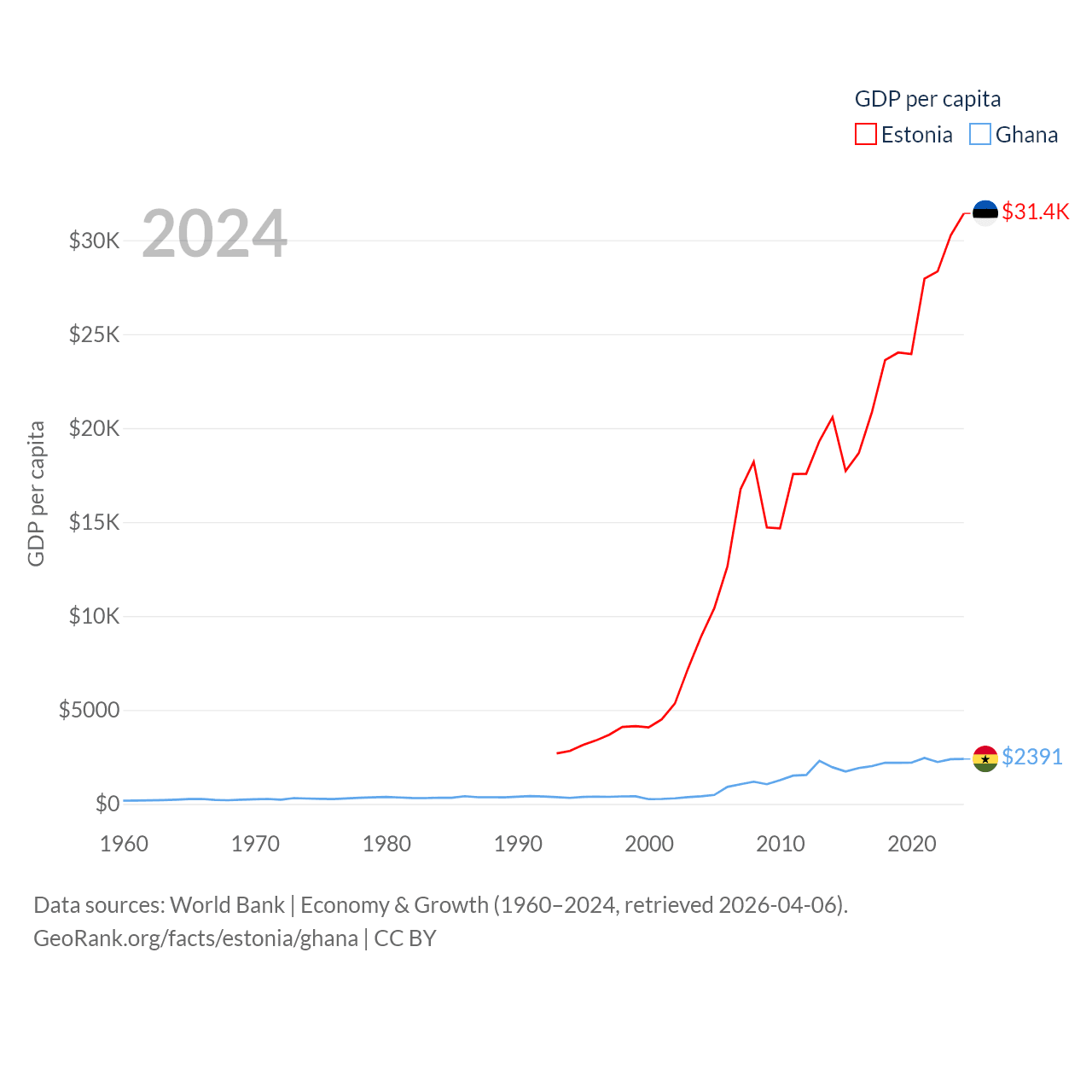 By GDP, Estonia ranks 100/197 ($43.1B) and Ghana ranks 80/197 ($82.3B). By GDP per capita, Estonia ranks 40/197 ($31,428), while Ghana ranks 151/197 ($2,391).