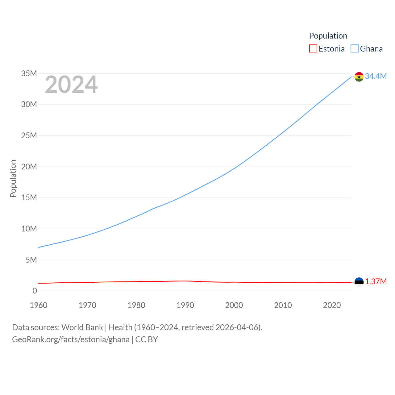 Estonia has a population of 1.37M (ranked 153/197), compared with 34.4M in Ghana (ranked 47/197). Estonia's land area is 16,498 sq mi versus 87,851 sq mi for Ghana (ranked 129th vs. 81st).