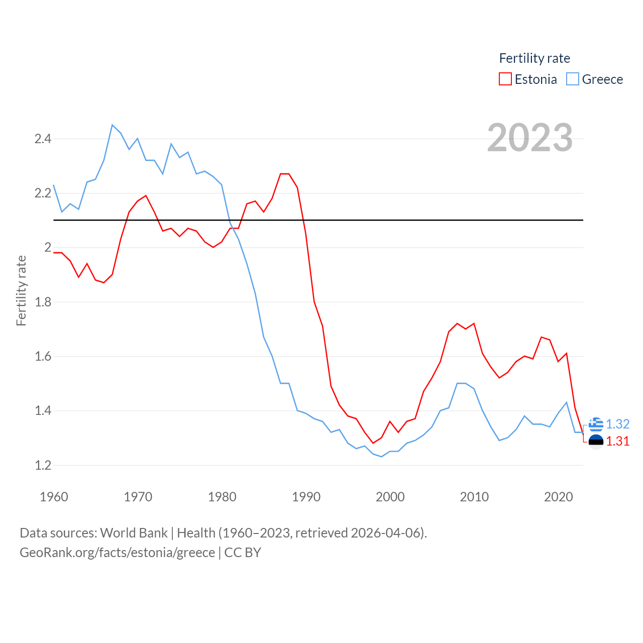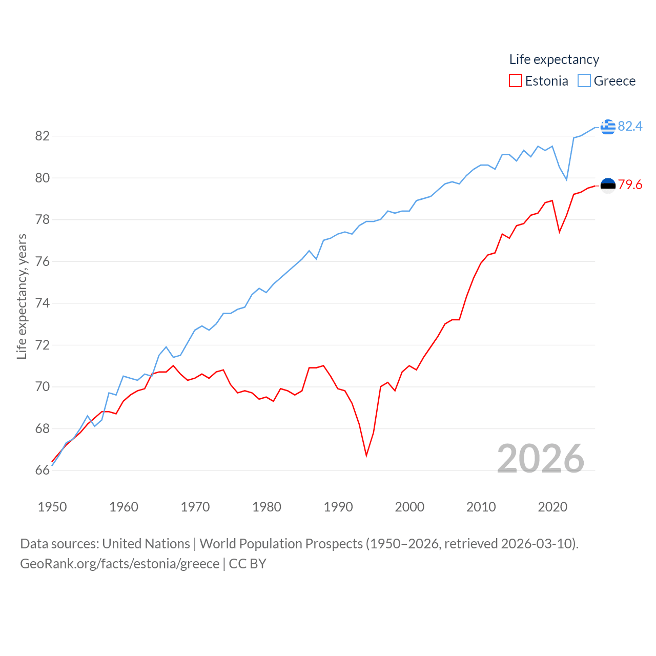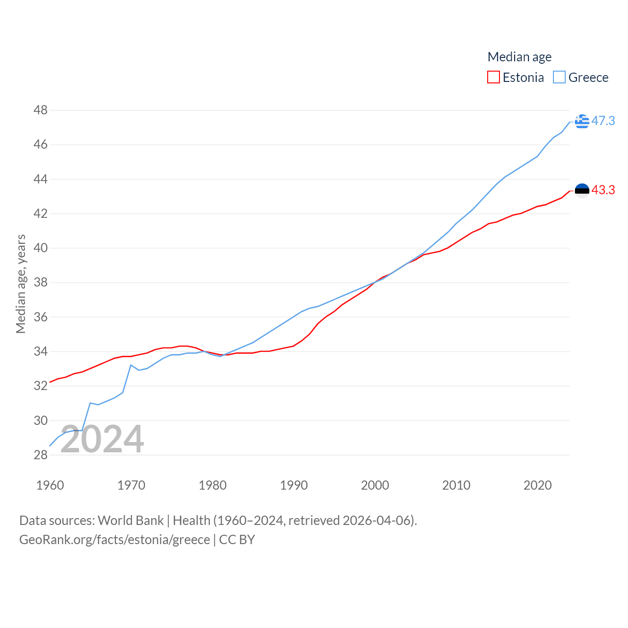 Estonia has a population of 1.37M (ranked 153/197), compared with 10.4M in Greece (ranked 94/197). Estonia's land area is 16,498 sq mi versus 49,769 sq mi for Greece (ranked 129th vs. 95th).