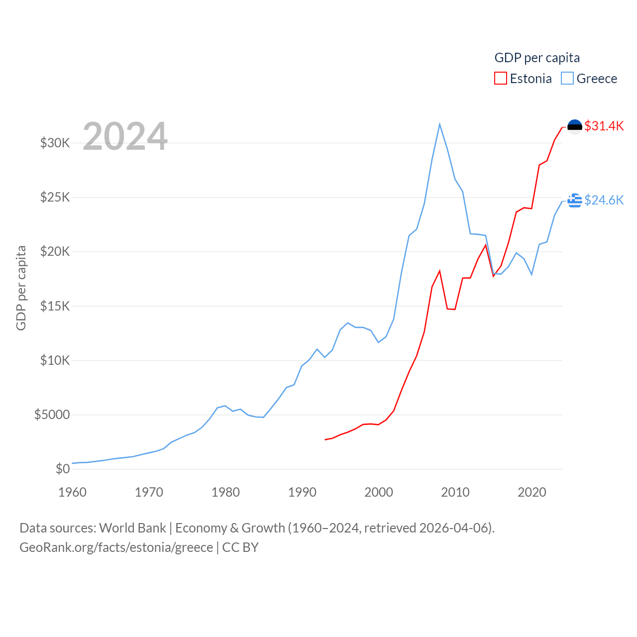 By GDP, Estonia ranks 100/197 ($43.1B) and Greece ranks 53/197 ($256B). By GDP per capita, Estonia ranks 40/197 ($31,428), while Greece ranks 49/197 ($24,626).