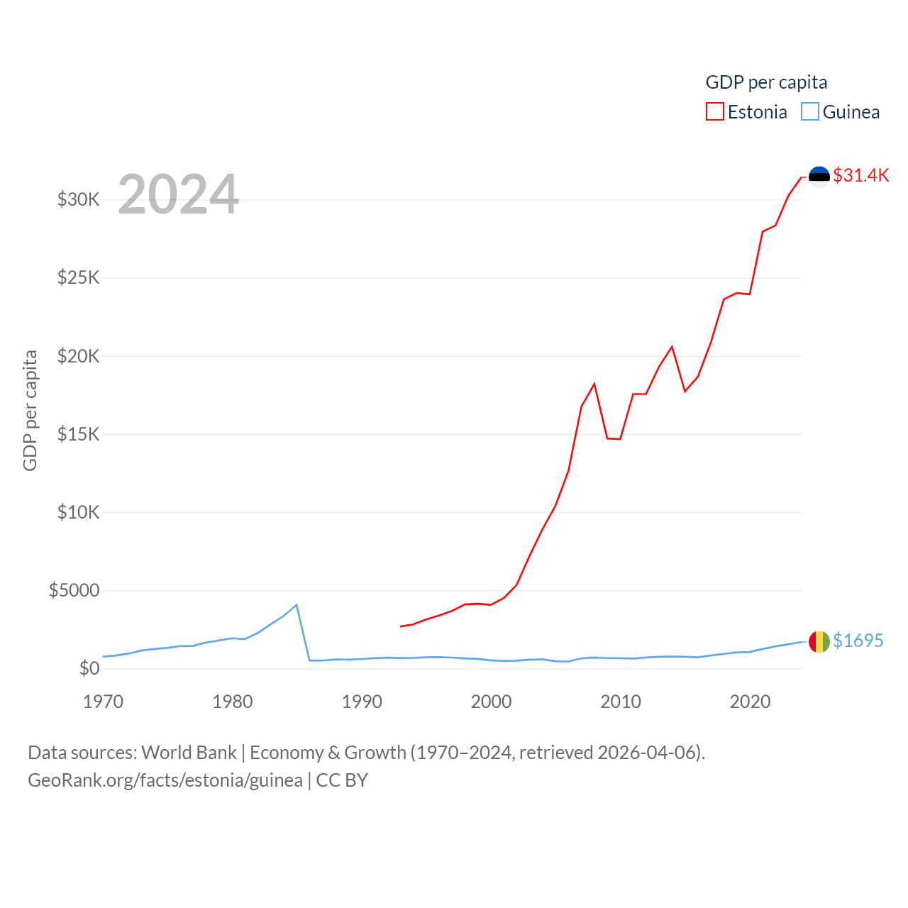 By GDP, Estonia ranks 100/197 ($43.1B) and Guinea ranks 118/197 ($25B). By GDP per capita, Estonia ranks 40/197 ($31,428), while Guinea ranks 160/197 ($1,695).