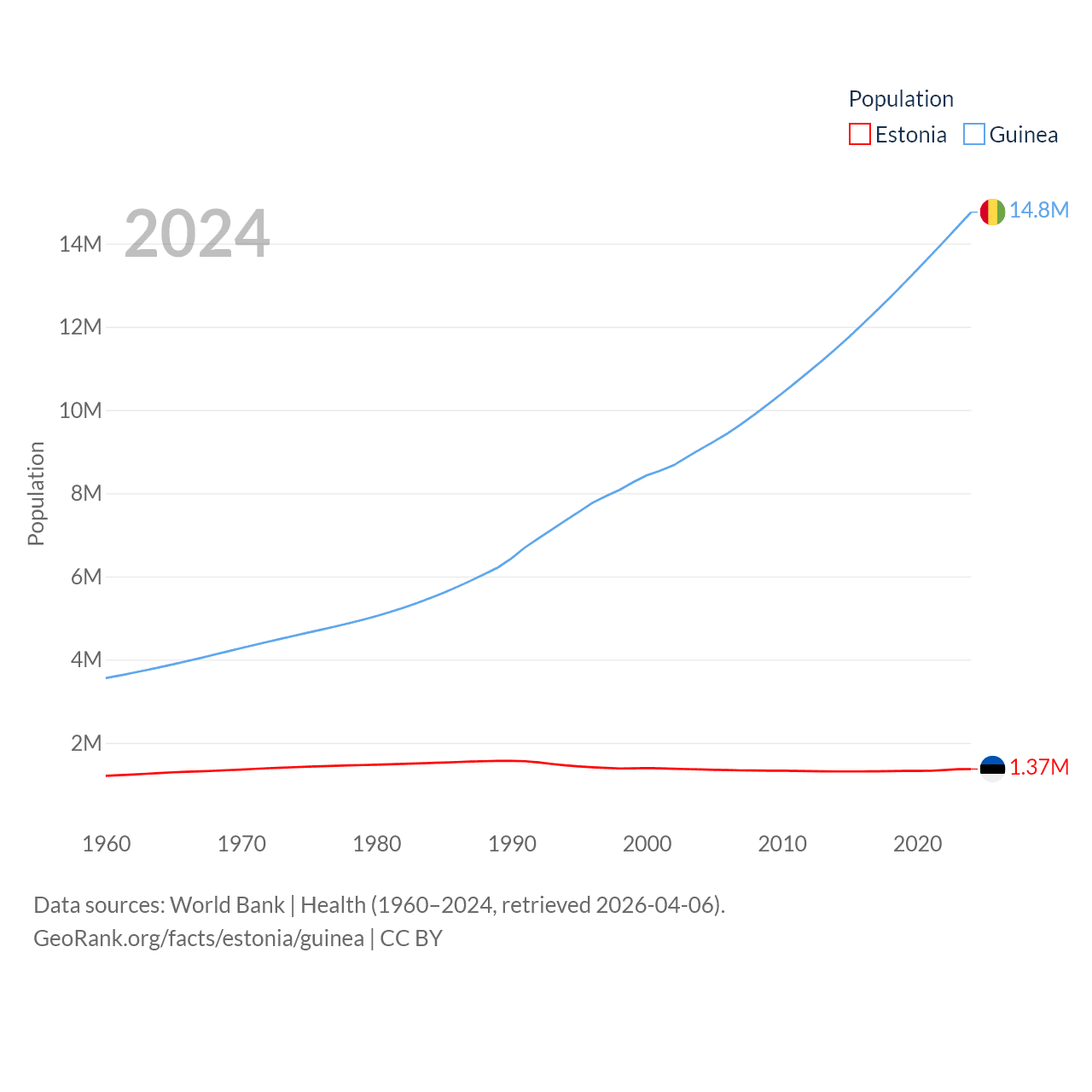 Estonia has a population of 1.37M (ranked 153/197), compared with 14.8M in Guinea (ranked 75/197). Estonia's land area is 16,498 sq mi versus 94,873 sq mi for Guinea (ranked 129th vs. 77th).