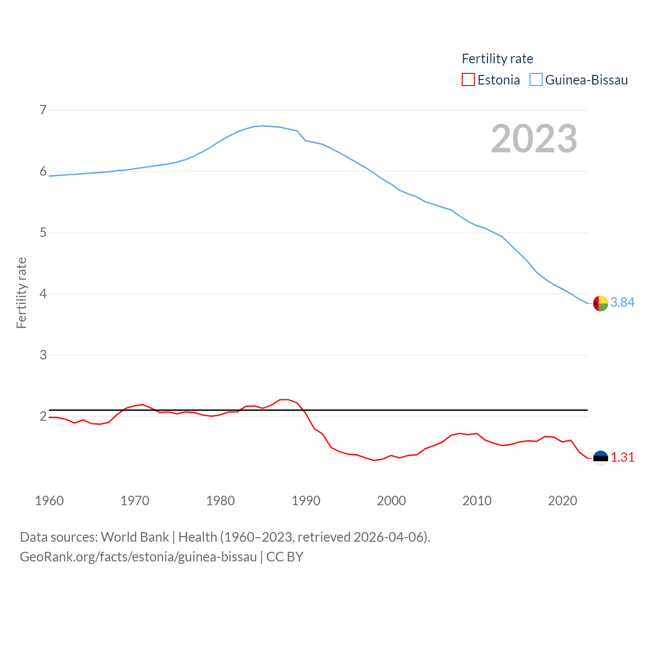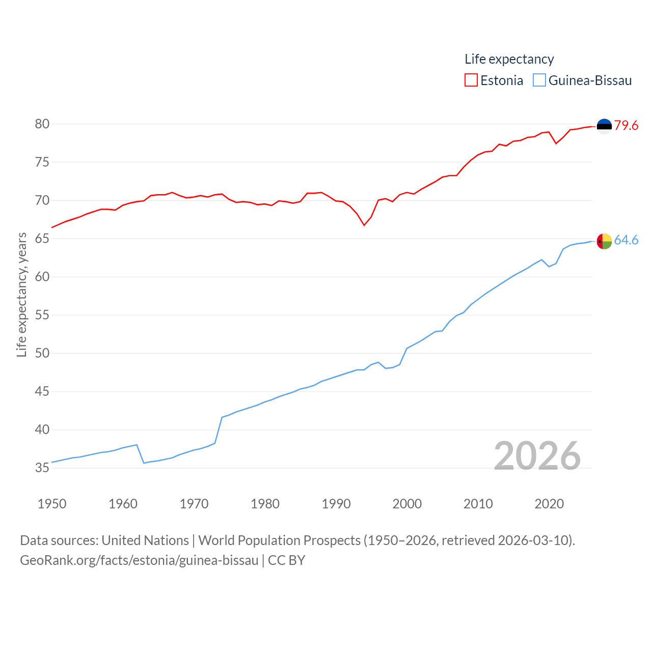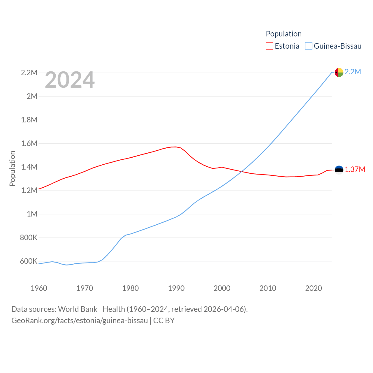 Estonia has a population of 1.37M (ranked 153/197), compared with 2.2M in Guinea-Bissau (ranked 146/197). Estonia's land area is 16,498 sq mi versus 10,857 sq mi for Guinea-Bissau (ranked 129th vs. 139th).
