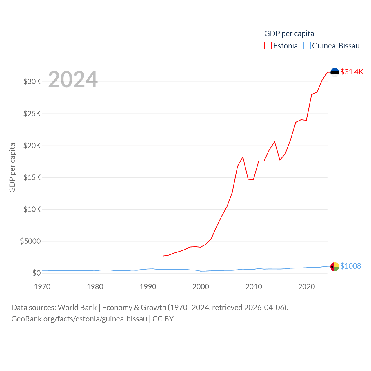 By GDP, Estonia ranks 100/197 ($43.1B) and Guinea-Bissau ranks 176/197 ($2.22B). By GDP per capita, Estonia ranks 40/197 ($31,428), while Guinea-Bissau ranks 177/197 ($1,008).