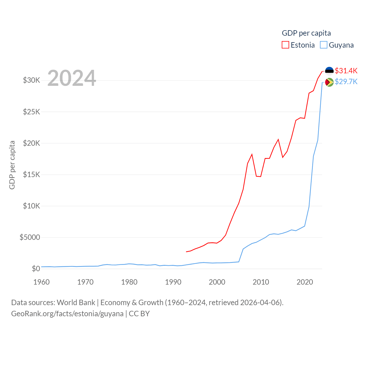 By GDP, Estonia ranks 100/197 ($43.1B) and Guyana ranks 120/197 ($24.7B). By GDP per capita, Estonia ranks 40/197 ($31,428), while Guyana ranks 41/197 ($29,675).