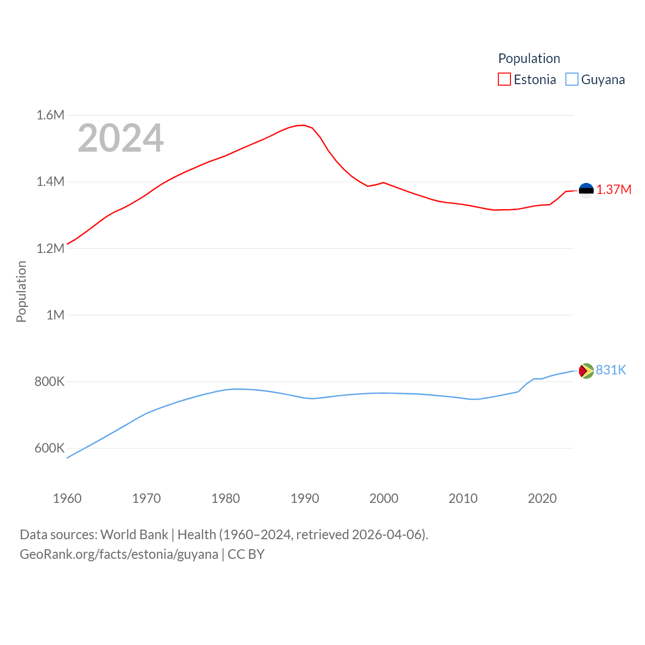 Estonia has a population of 1.37M (ranked 153/197), compared with 831K in Guyana (ranked 161/197). Estonia's land area is 16,498 sq mi versus 81,522 sq mi for Guyana (ranked 129th vs. 82nd).
