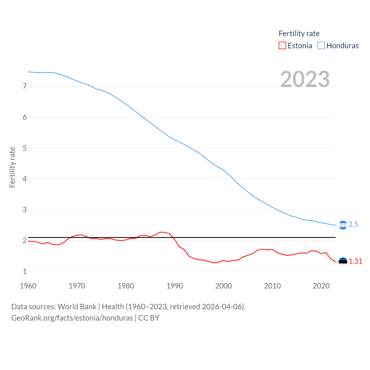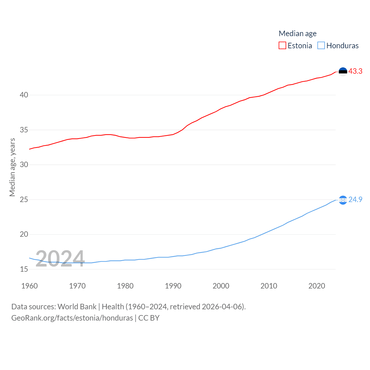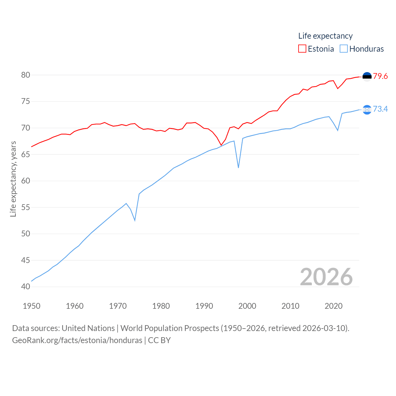 Estonia has a population of 1.37M (ranked 153/197), compared with 10.8M in Honduras (ranked 89/197). Estonia's land area is 16,498 sq mi versus 43,201 sq mi for Honduras (ranked 129th vs. 100th).