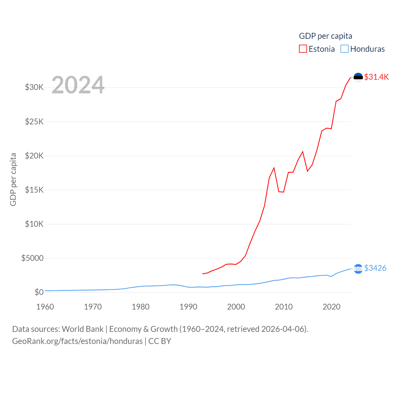 By GDP, Estonia ranks 100/197 ($43.1B) and Honduras ranks 104/197 ($37.1B). By GDP per capita, Estonia ranks 40/197 ($31,428), while Honduras ranks 136/197 ($3,426).