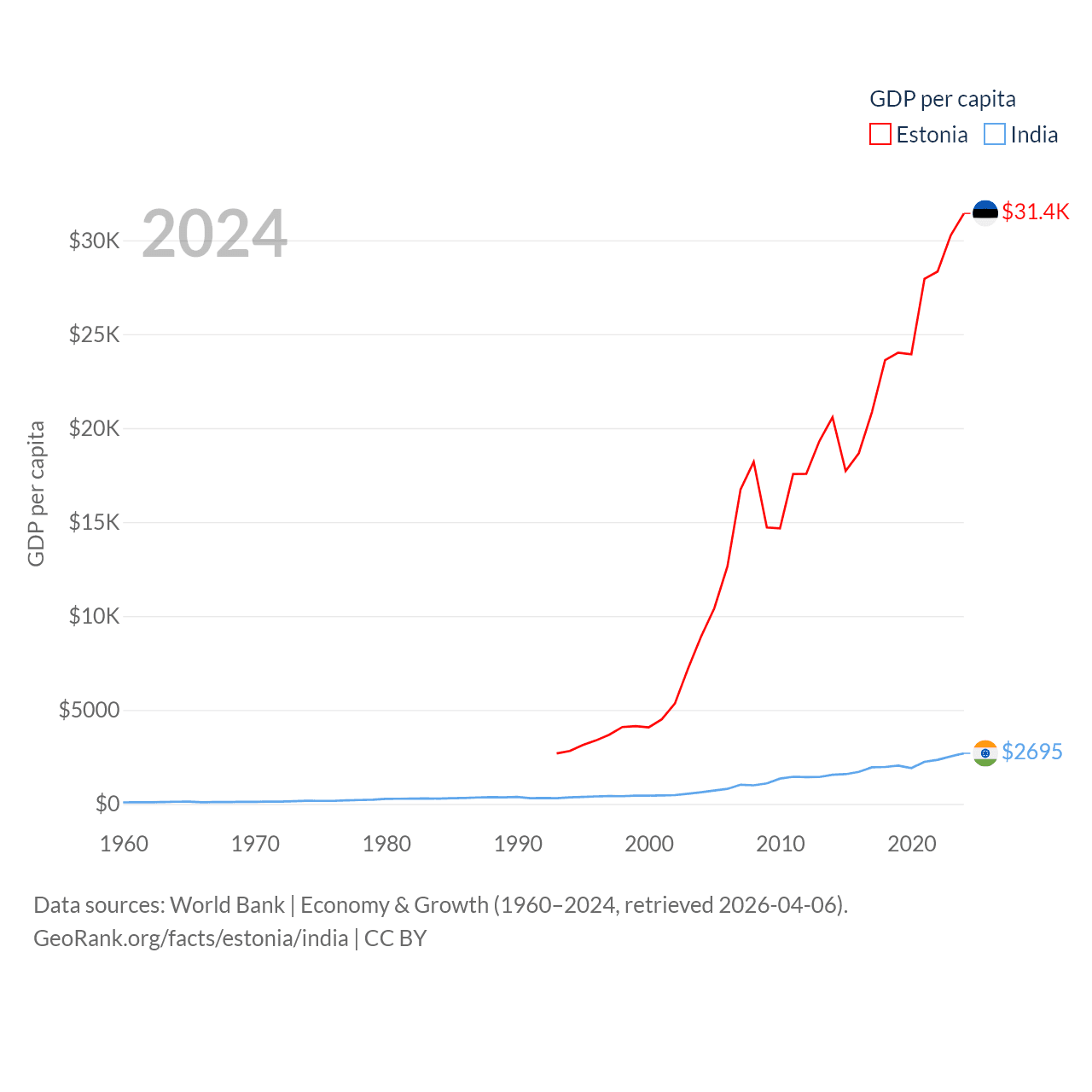 By GDP, Estonia ranks 100/197 ($43.1B) and India ranks 5/197 ($3.91T). By GDP per capita, Estonia ranks 40/197 ($31,428), while India ranks 143/197 ($2,695).