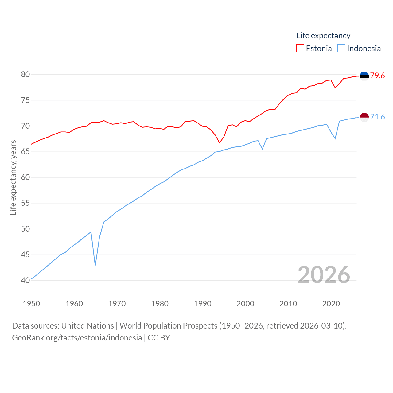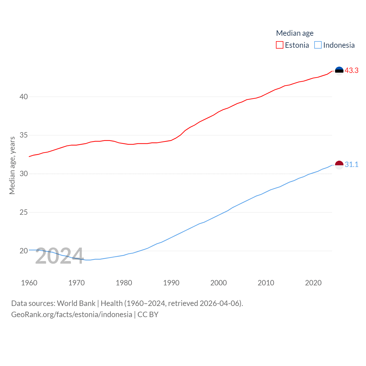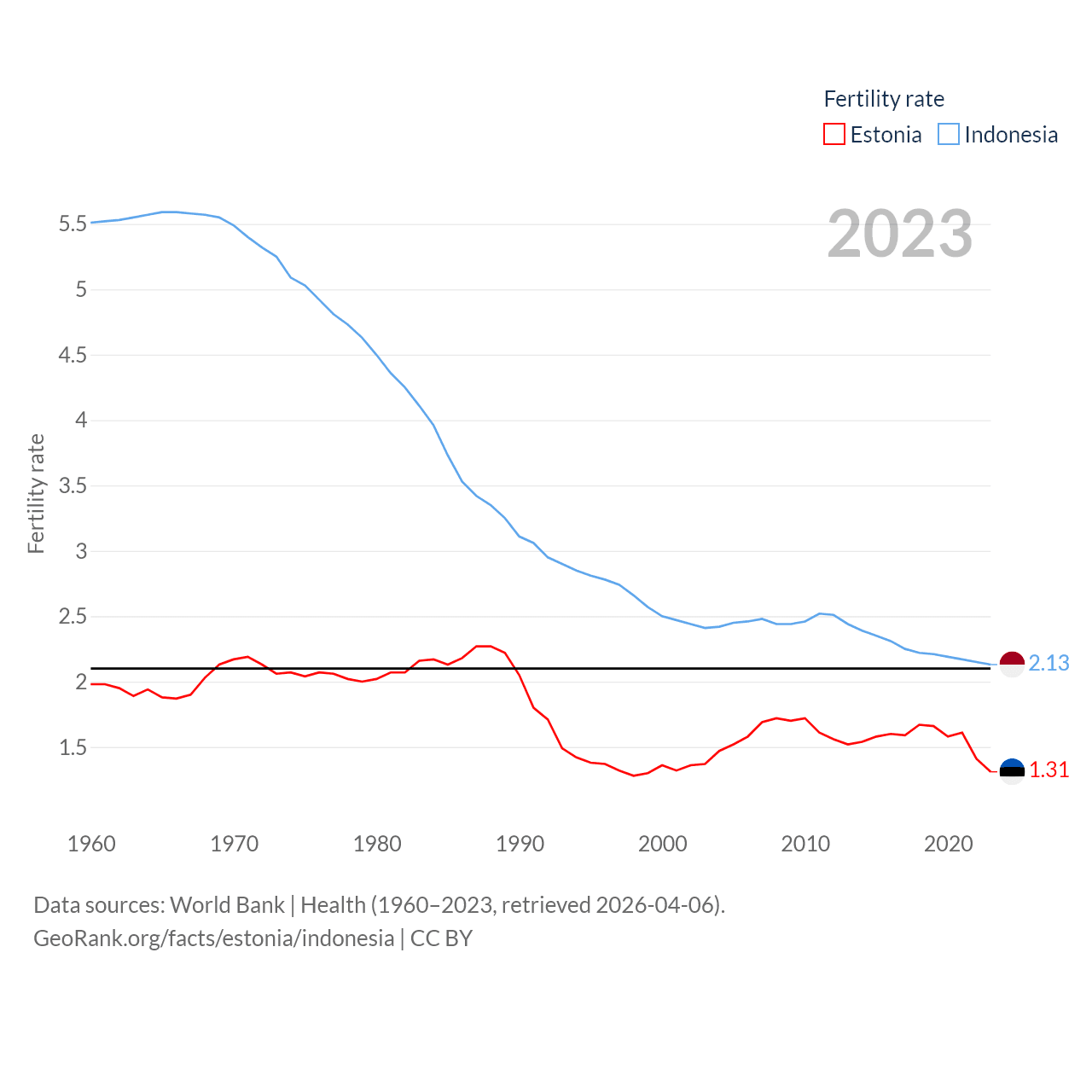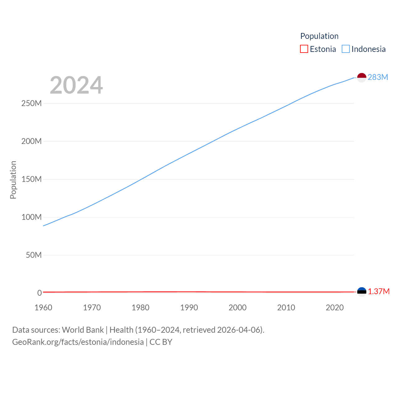Estonia has a population of 1.37M (ranked 153/197), compared with 283M in Indonesia (ranked 4/197). Estonia's land area is 16,498 sq mi versus 730,720 sq mi for Indonesia (ranked 129th vs. 14th).