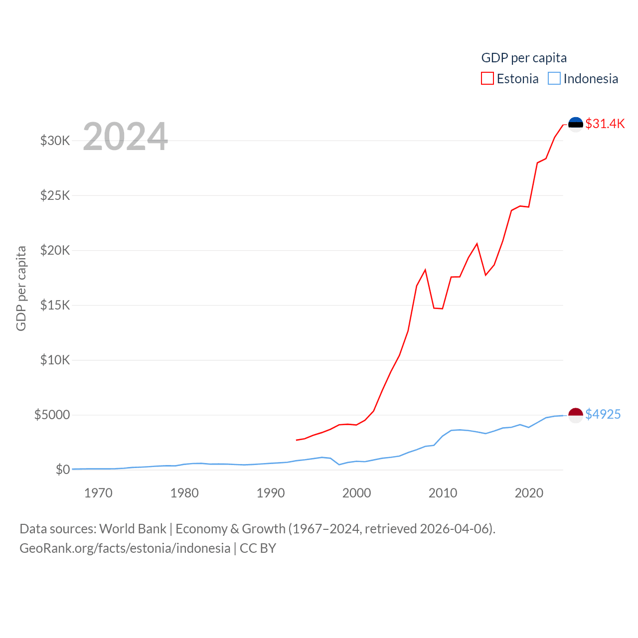 By GDP, Estonia ranks 100/197 ($43.1B) and Indonesia ranks 16/197 ($1.4T). By GDP per capita, Estonia ranks 40/197 ($31,428), while Indonesia ranks 121/197 ($4,925).
