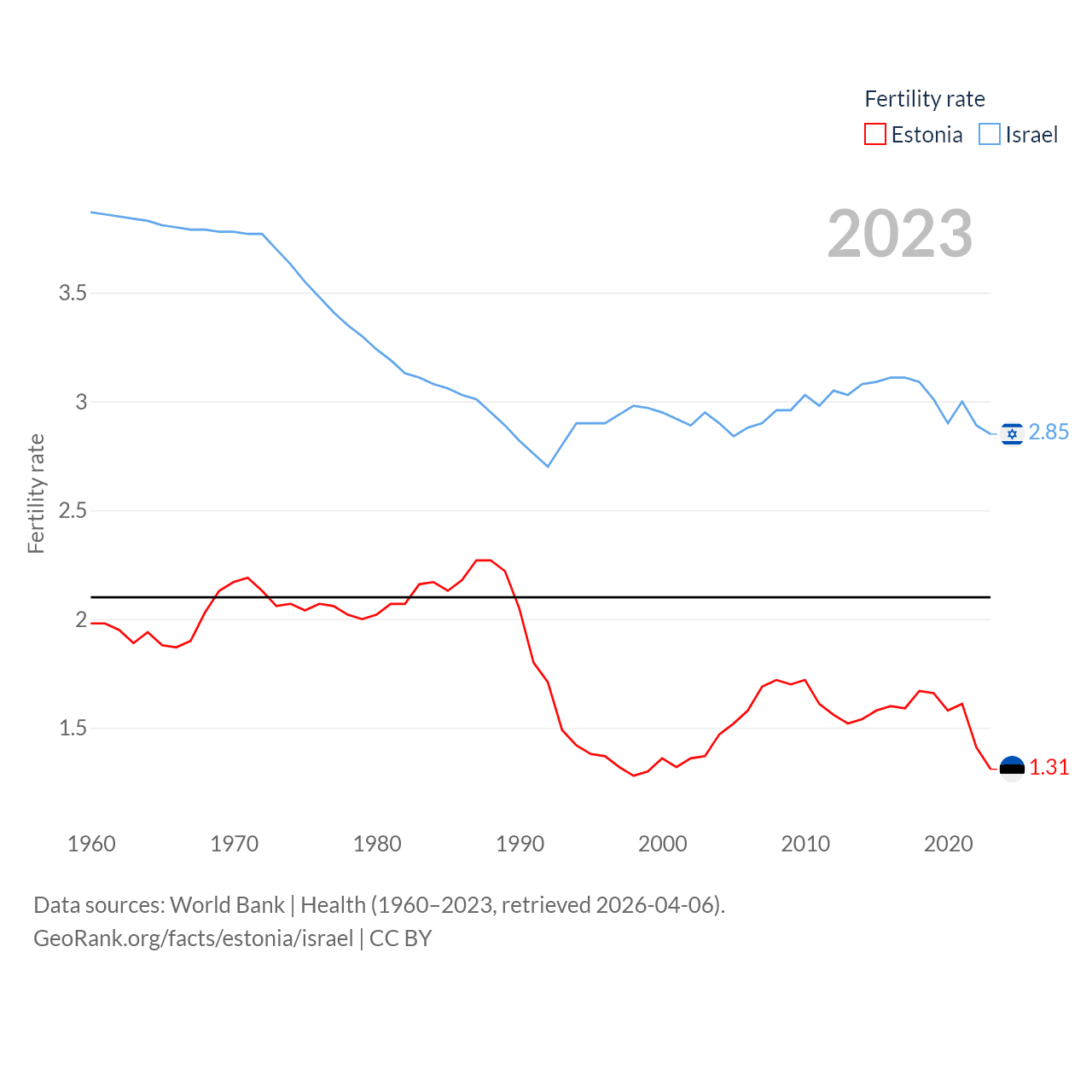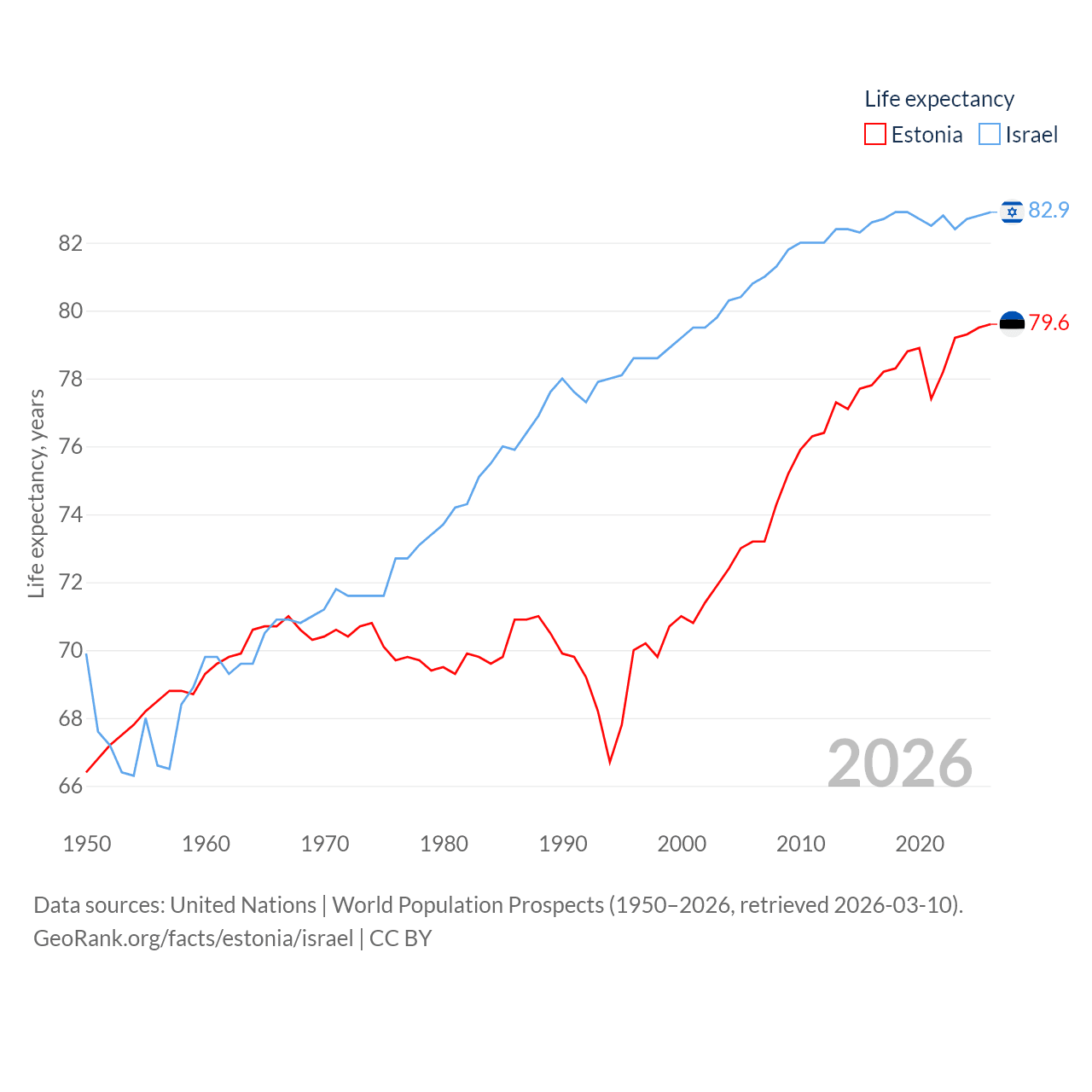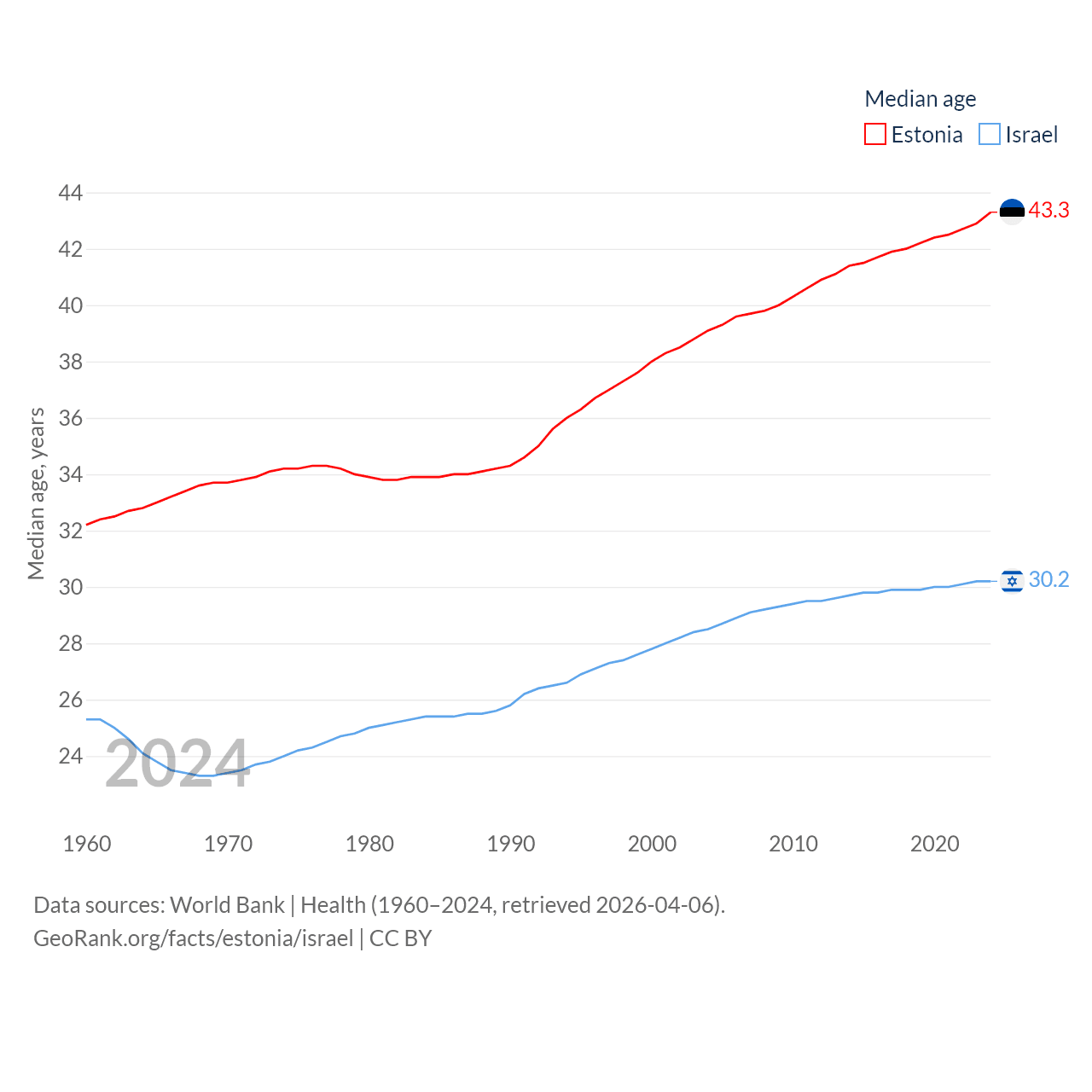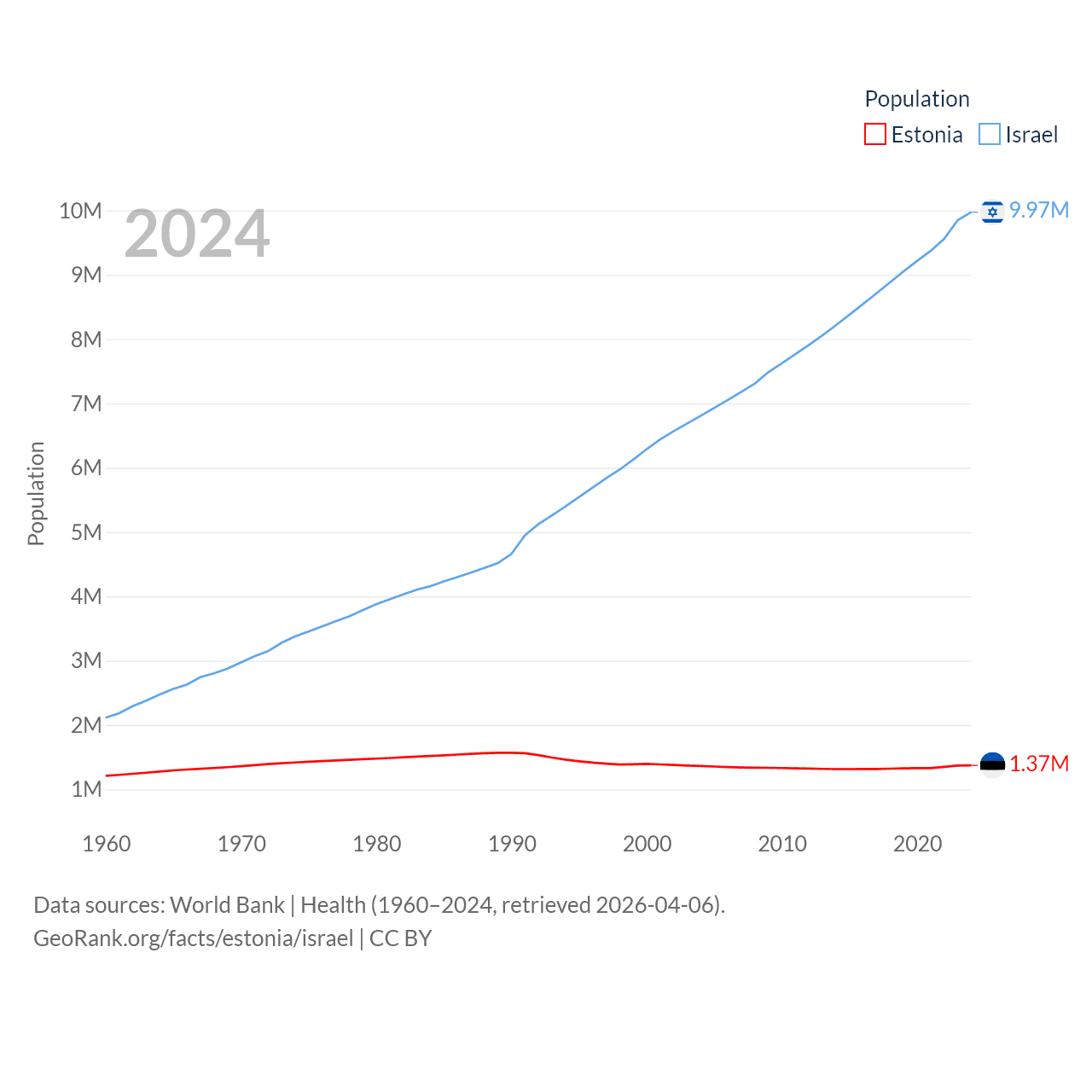 Estonia has a population of 1.37M (ranked 153/197), compared with 9.97M in Israel (ranked 96/197). Estonia's land area is 16,498 sq mi versus 8,355 sq mi for Israel (ranked 129th vs. 149th).