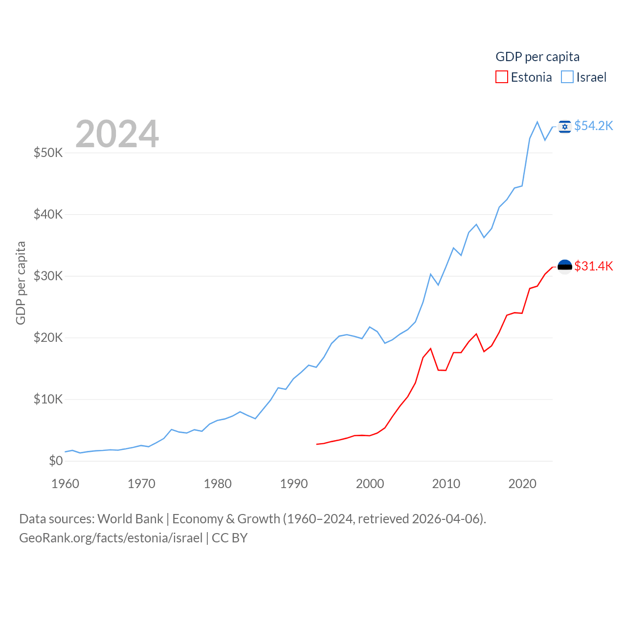 By GDP, Estonia ranks 100/197 ($43.1B) and Israel ranks 29/197 ($540B). By GDP per capita, Estonia ranks 40/197 ($31,428), while Israel ranks 21/197 ($54,177).