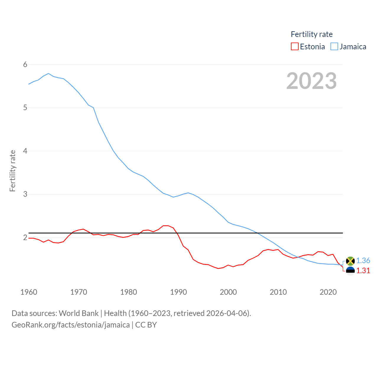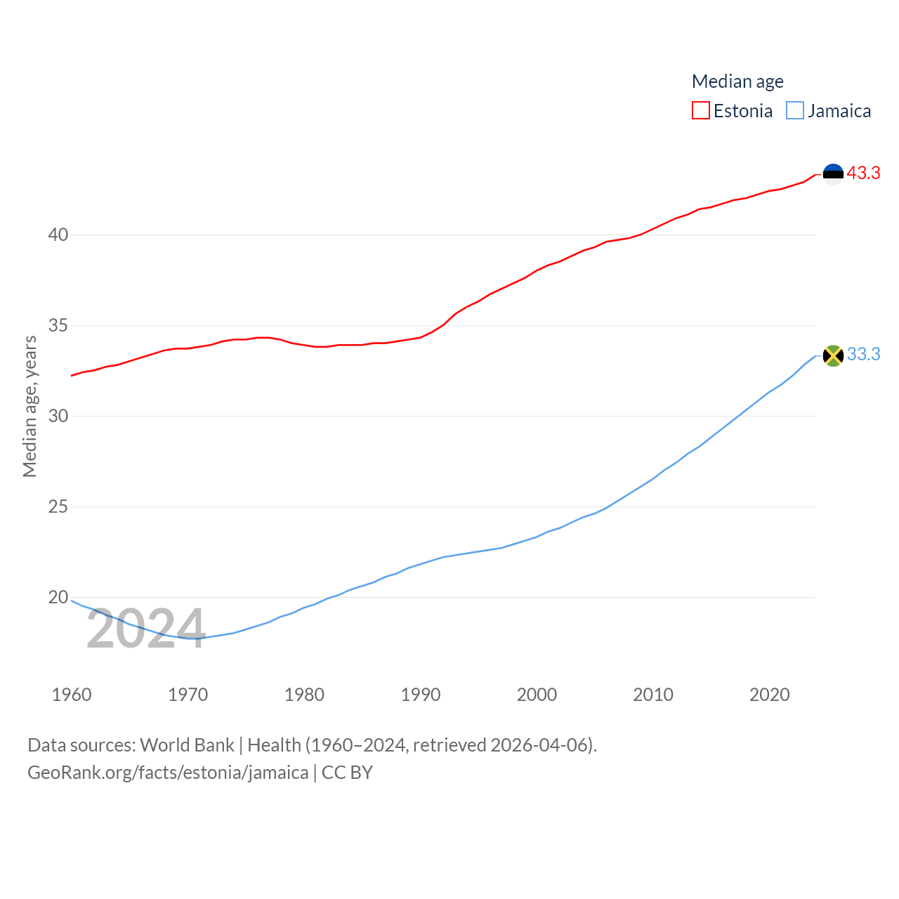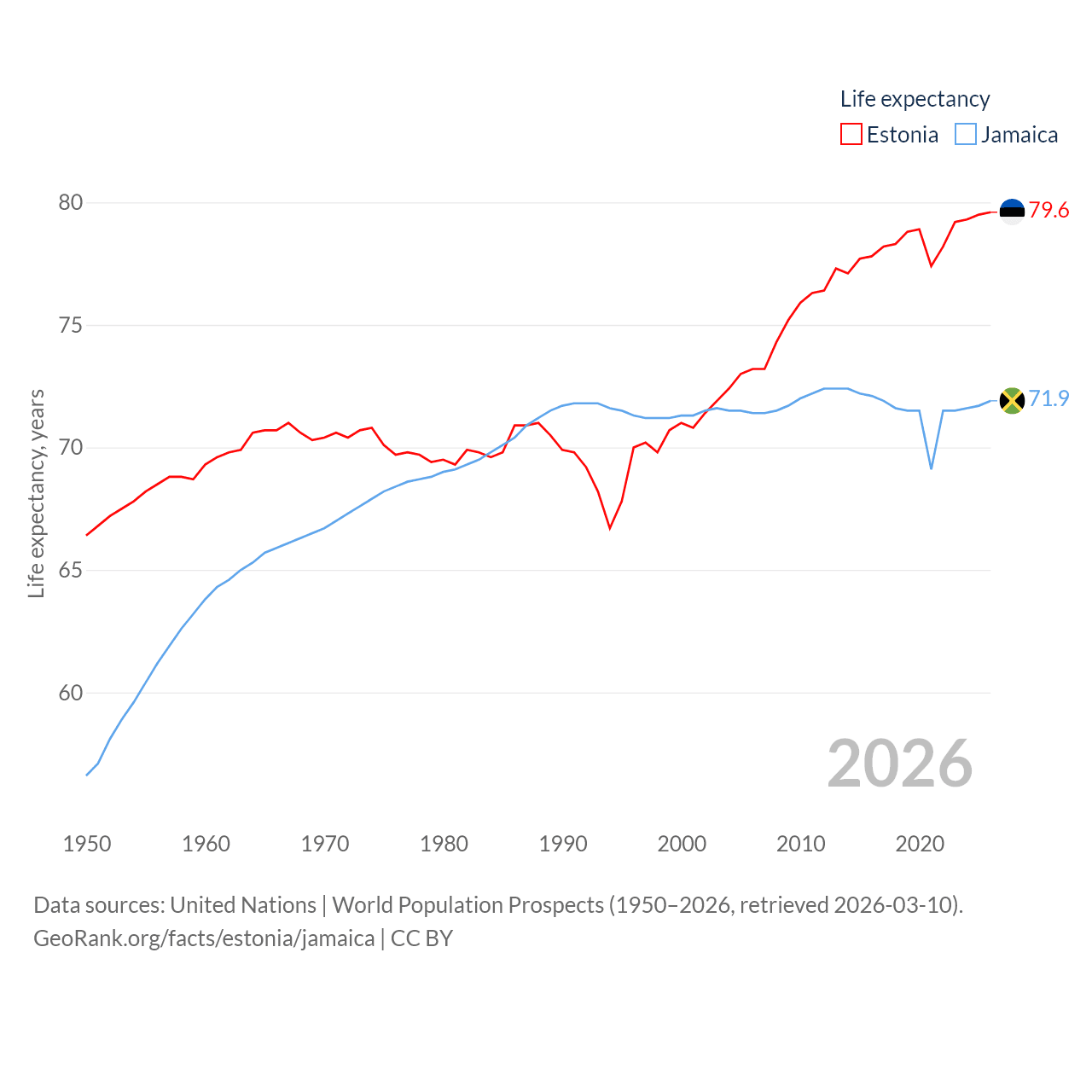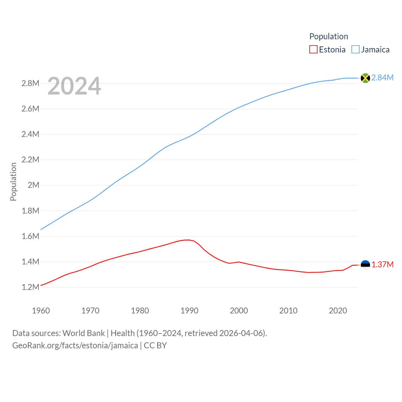 Estonia has a population of 1.37M (ranked 153/197), compared with 2.84M in Jamaica (ranked 139/197). Estonia's land area is 16,498 sq mi versus 4,181 sq mi for Jamaica (ranked 129th vs. 159th).