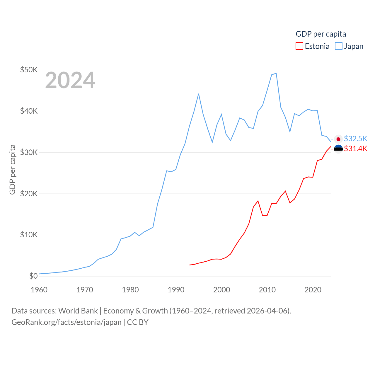By GDP, Estonia ranks 100/197 ($43.1B) and Japan ranks 4/197 ($4.03T). By GDP per capita, Estonia ranks 40/197 ($31,428), while Japan ranks 38/197 ($32,487).