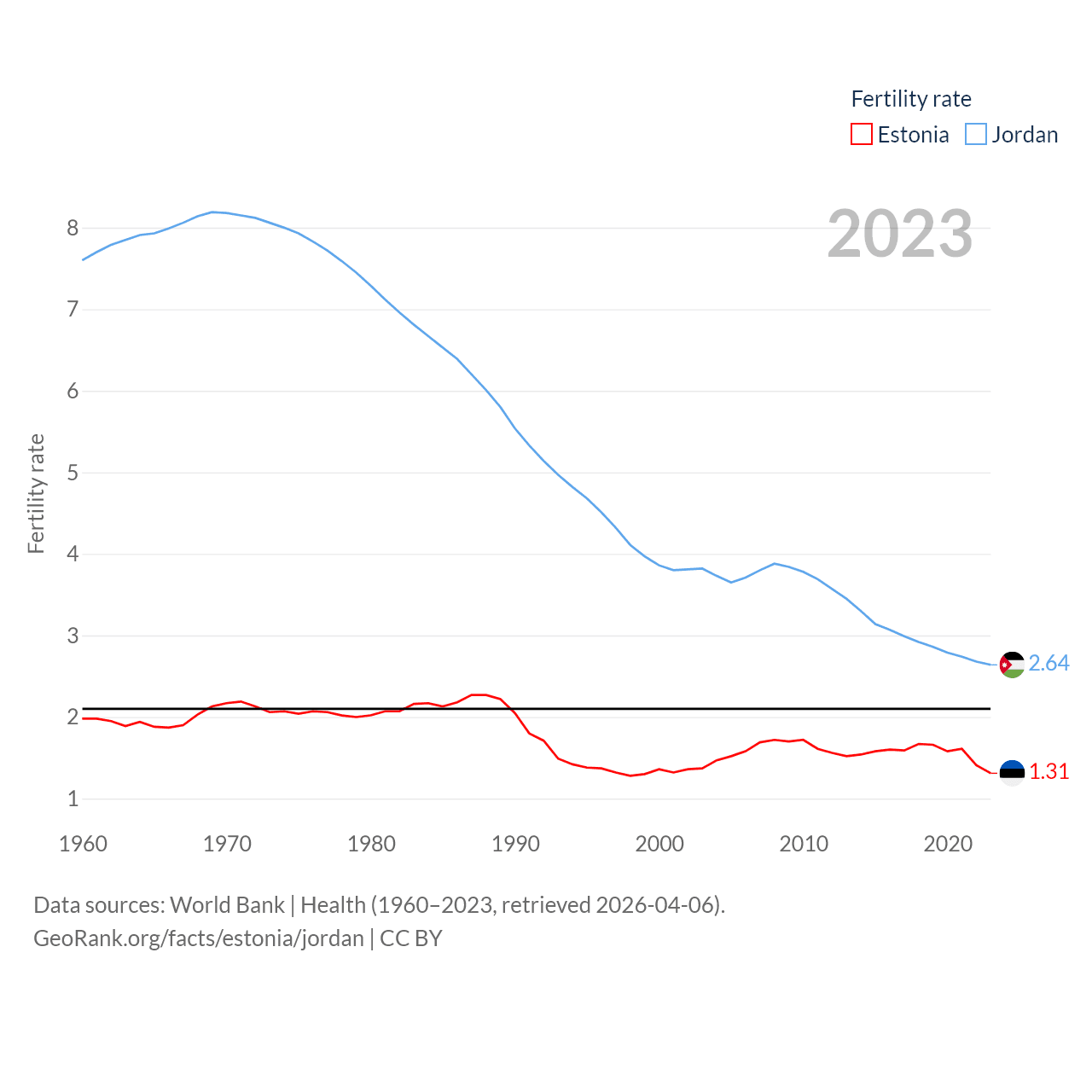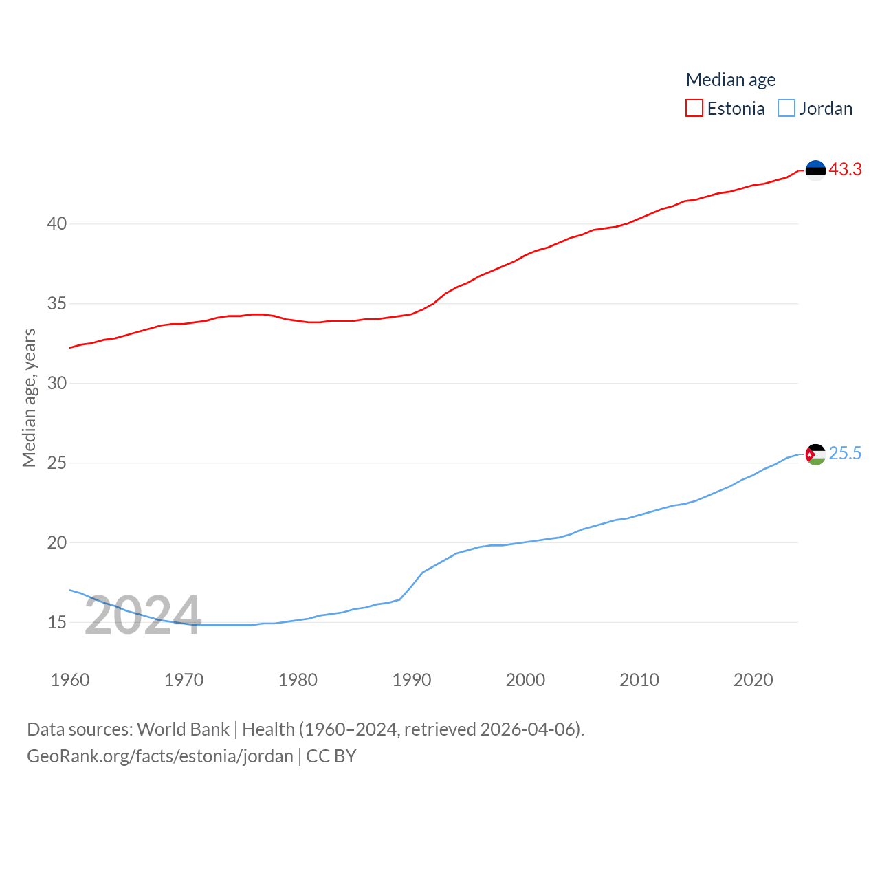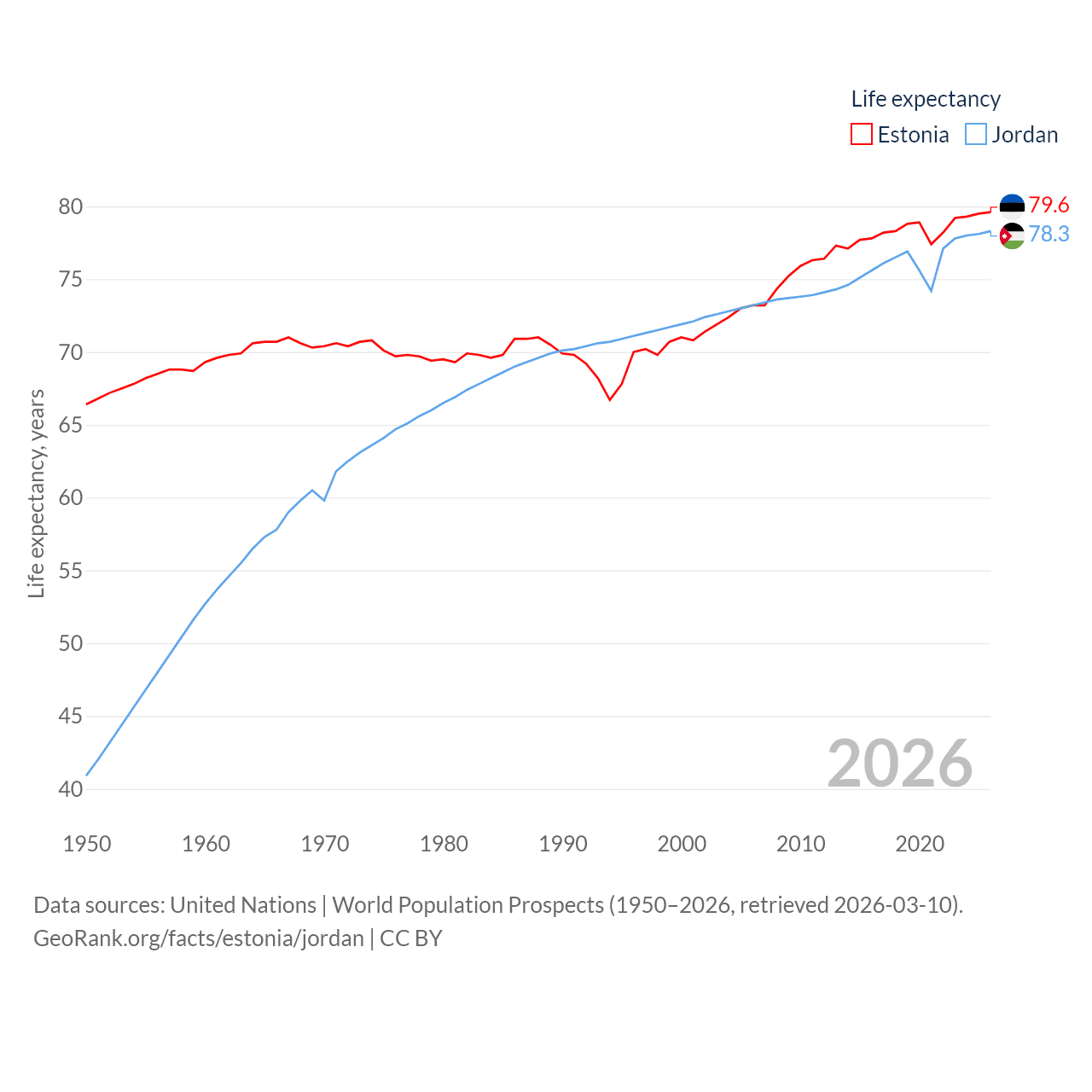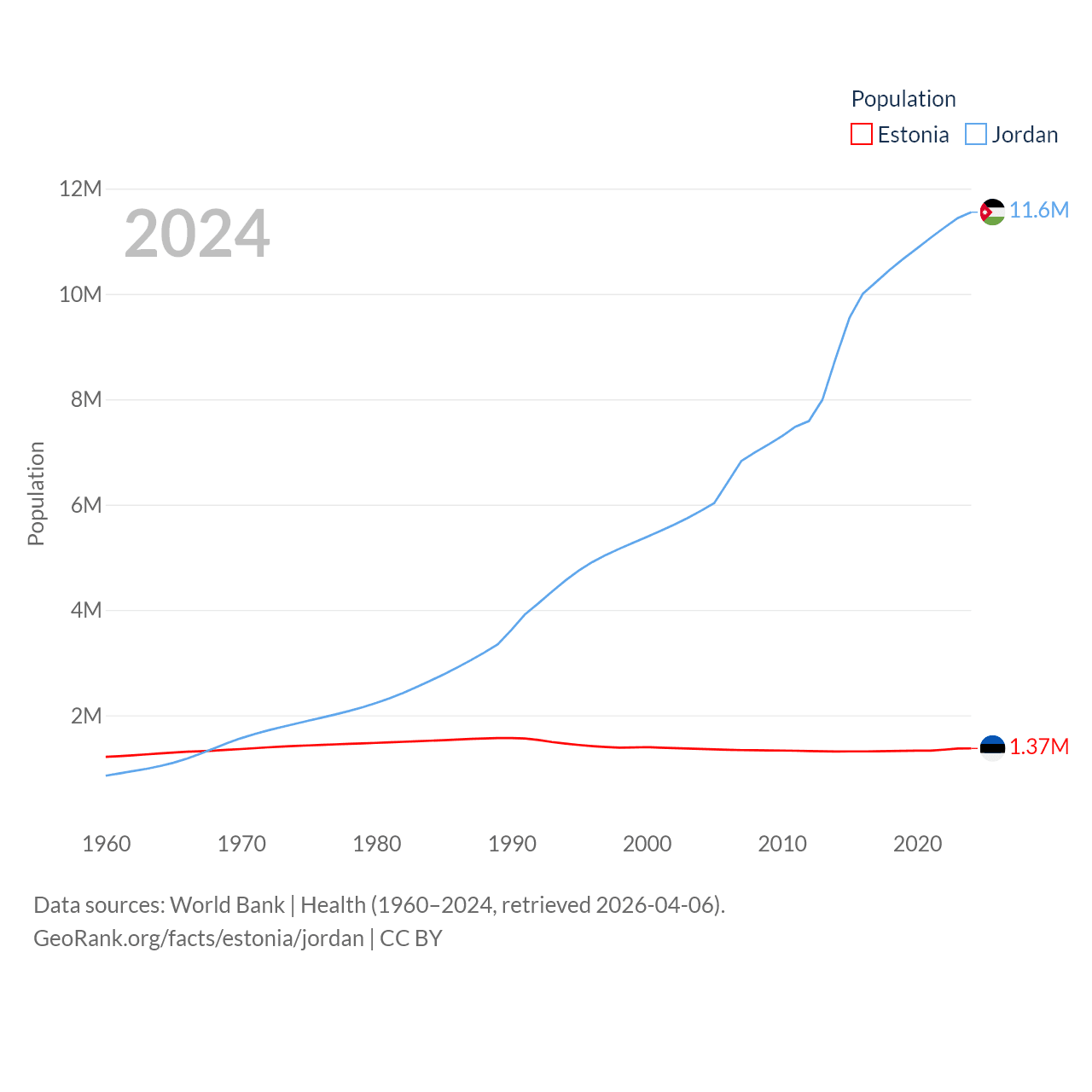 Estonia has a population of 1.37M (ranked 153/197), compared with 11.6M in Jordan (ranked 84/197). Estonia's land area is 16,498 sq mi versus 34,284 sq mi for Jordan (ranked 129th vs. 110th).