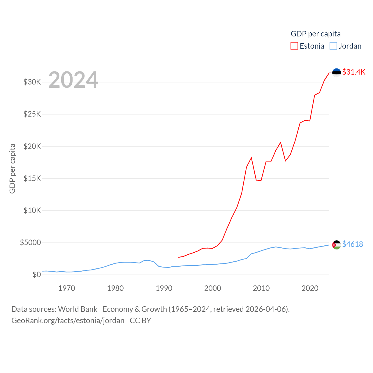 By GDP, Estonia ranks 100/197 ($43.1B) and Jordan ranks 90/197 ($53.4B). By GDP per capita, Estonia ranks 40/197 ($31,428), while Jordan ranks 123/197 ($4,618).