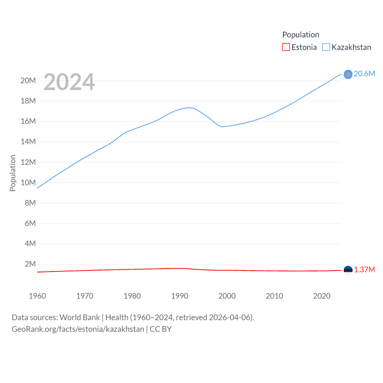 Estonia has a population of 1.37M (ranked 153/197), compared with 20.6M in Kazakhstan (ranked 64/197). Estonia's land area is 16,498 sq mi versus 1,042,360 sq mi for Kazakhstan (ranked 129th vs. 9th).