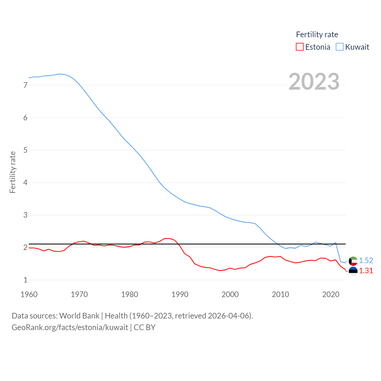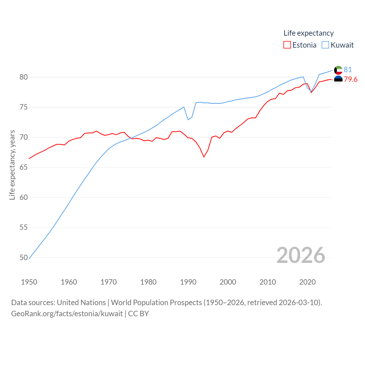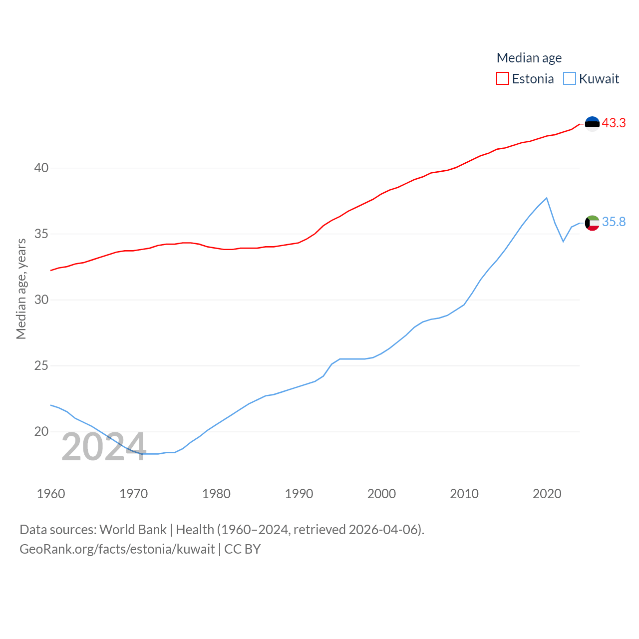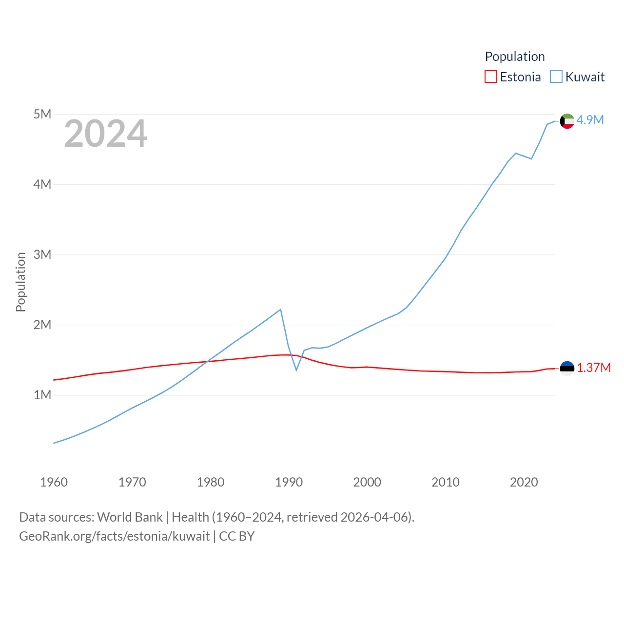 Estonia has a population of 1.37M (ranked 153/197), compared with 4.9M in Kuwait (ranked 127/197). Estonia's land area is 16,498 sq mi versus 6,880 sq mi for Kuwait (ranked 129th vs. 153rd).