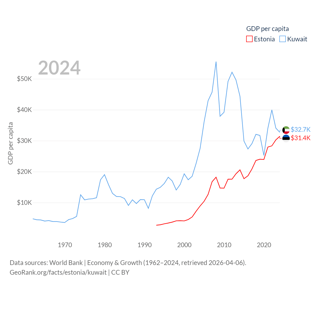 By GDP, Estonia ranks 100/197 ($43.1B) and Kuwait ranks 59/197 ($160B). By GDP per capita, Estonia ranks 40/197 ($31,428), while Kuwait ranks 37/197 ($32,718).