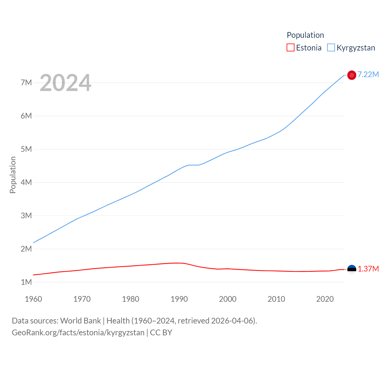 Estonia has a population of 1.37M (ranked 153/197), compared with 7.22M in Kyrgyzstan (ranked 106/197). Estonia's land area is 16,498 sq mi versus 74,054 sq mi for Kyrgyzstan (ranked 129th vs. 86th).