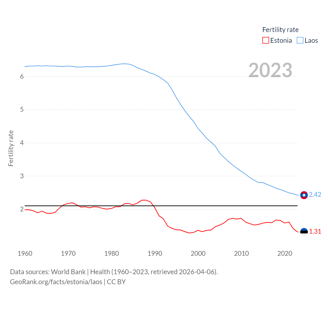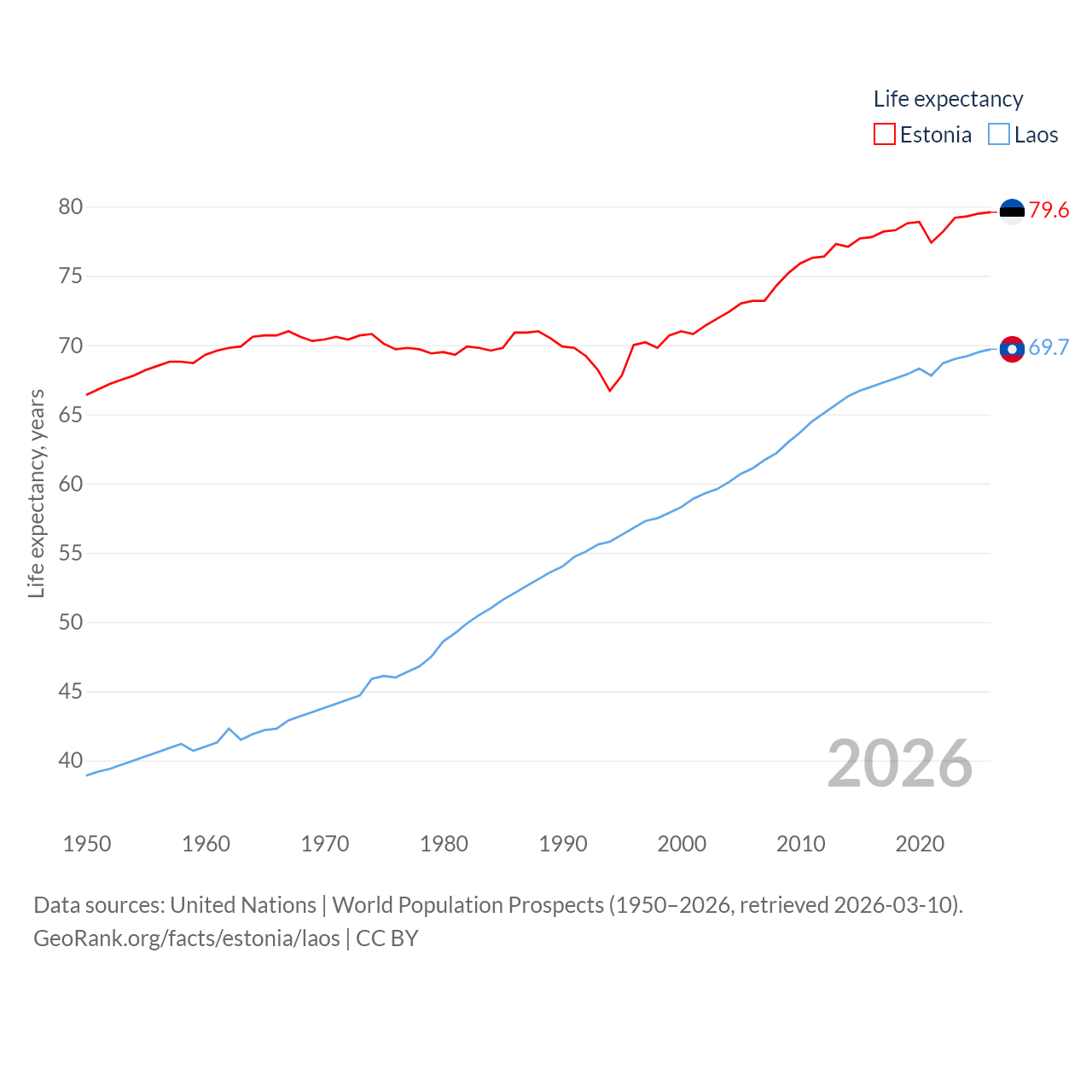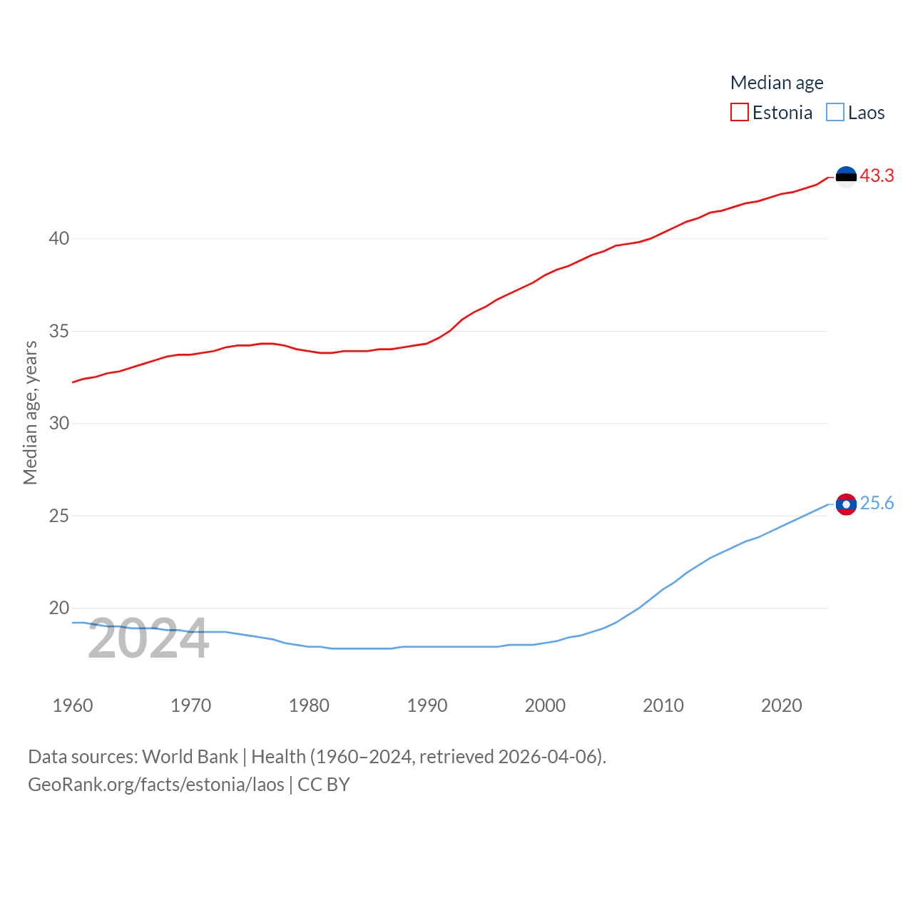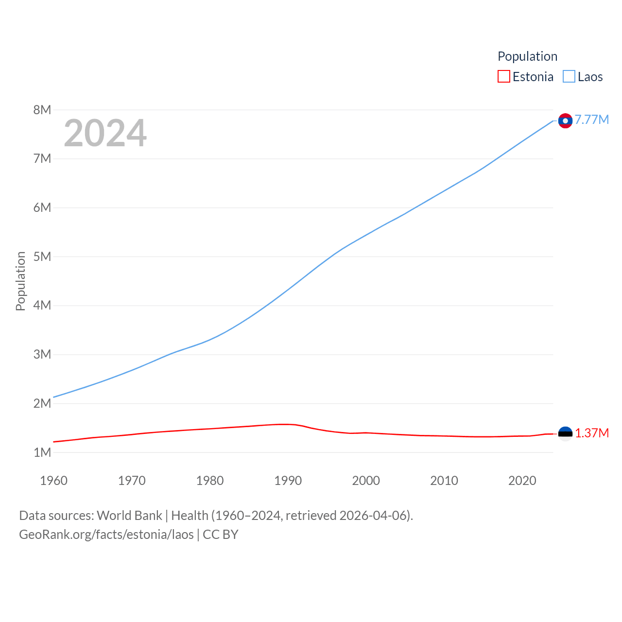 Estonia has a population of 1.37M (ranked 153/197), compared with 7.77M in Laos (ranked 103/197). Estonia's land area is 16,498 sq mi versus 89,112 sq mi for Laos (ranked 129th vs. 79th).