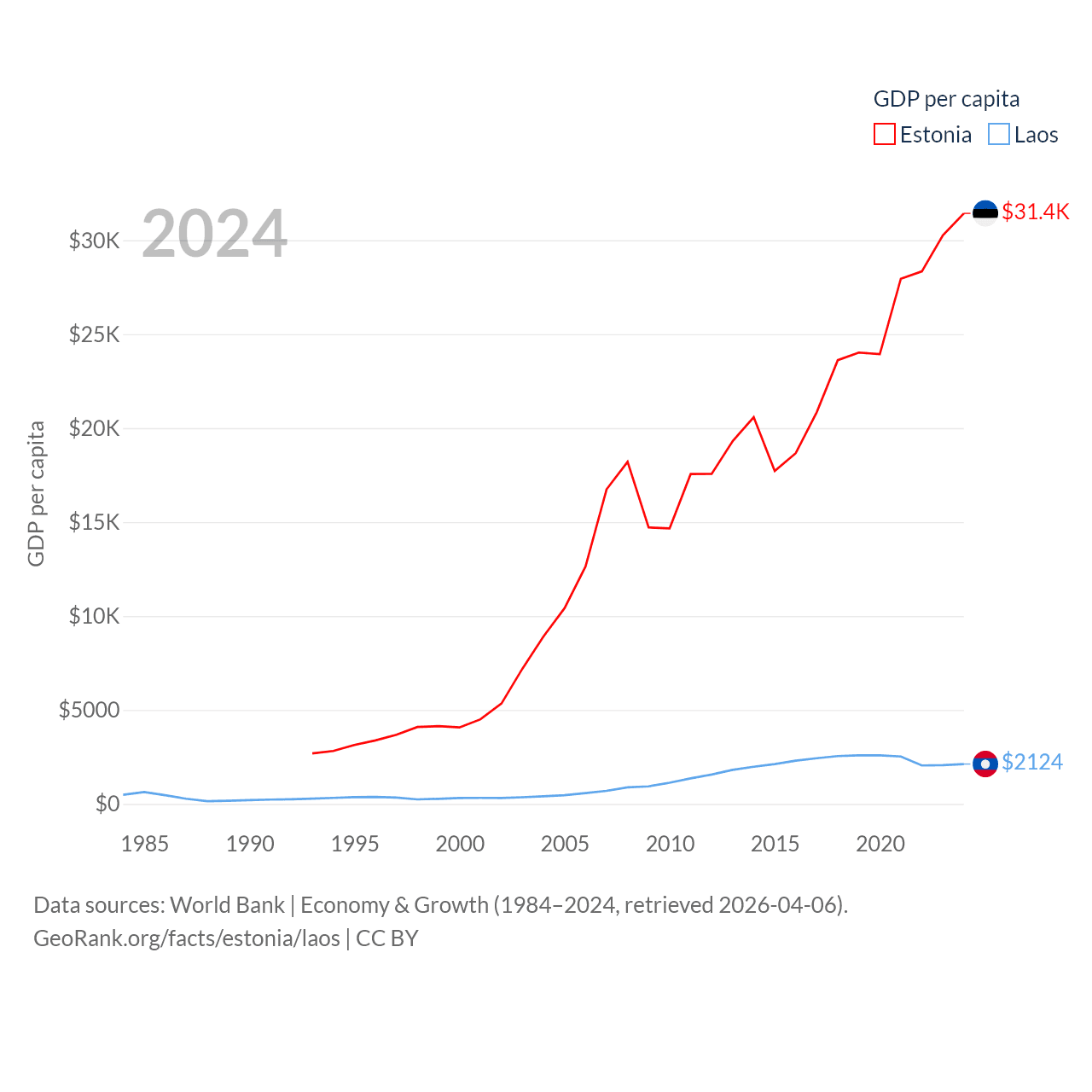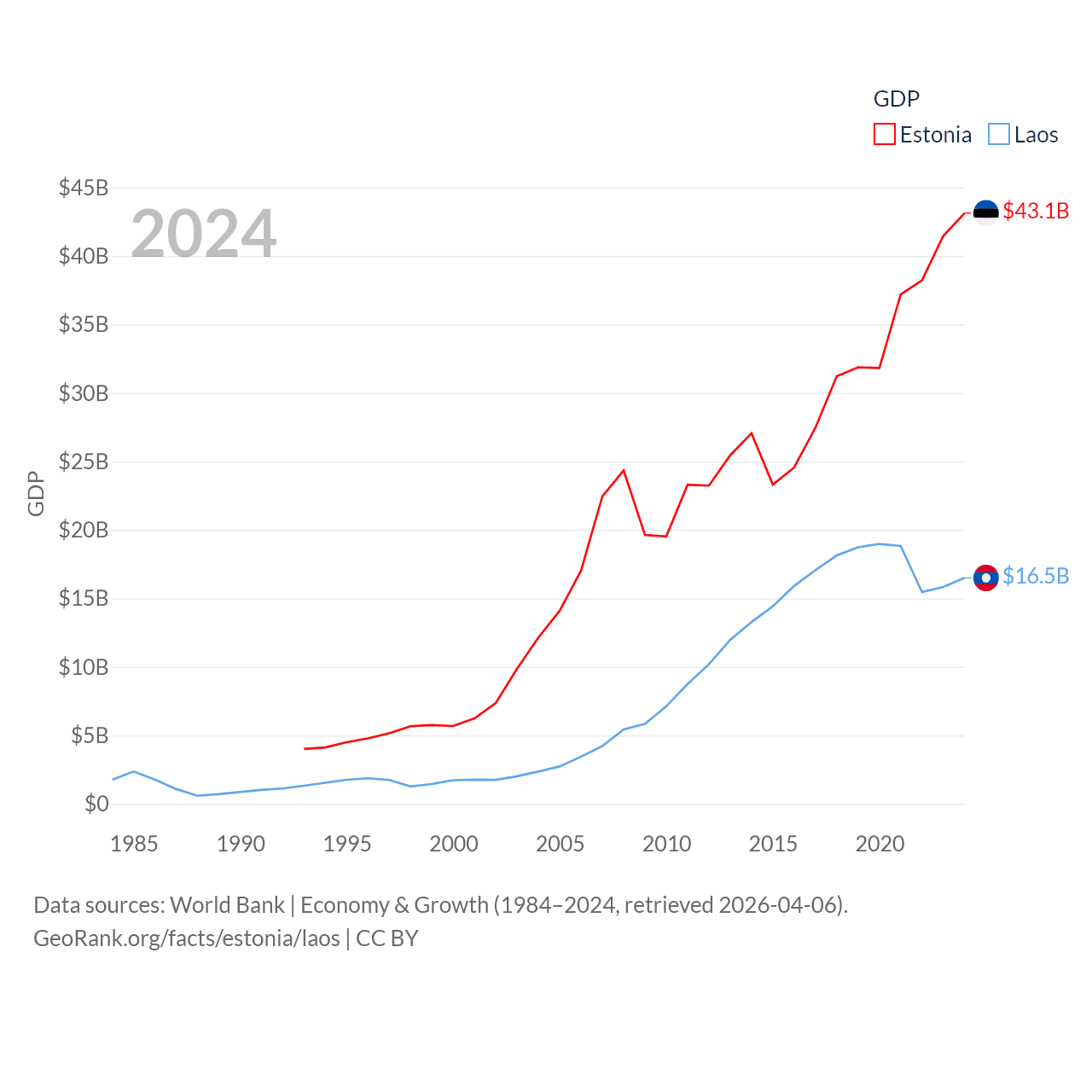 By GDP, Estonia ranks 100/197 ($43.1B) and Laos ranks 139/197 ($16.5B). By GDP per capita, Estonia ranks 40/197 ($31,428), while Laos ranks 155/197 ($2,124).