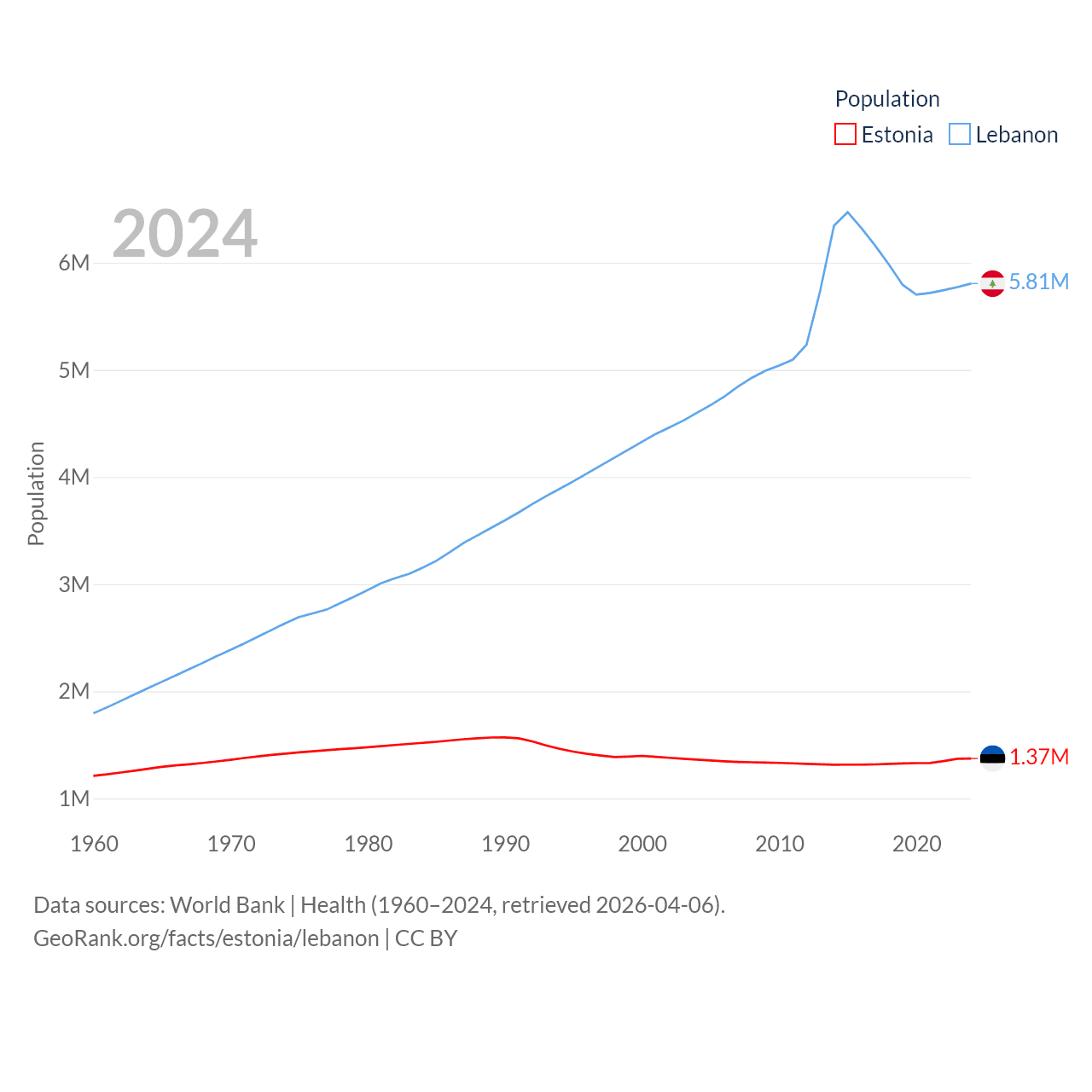 Estonia has a population of 1.37M (ranked 153/197), compared with 5.81M in Lebanon (ranked 115/197). Estonia's land area is 16,498 sq mi versus 3,950 sq mi for Lebanon (ranked 129th vs. 160th).