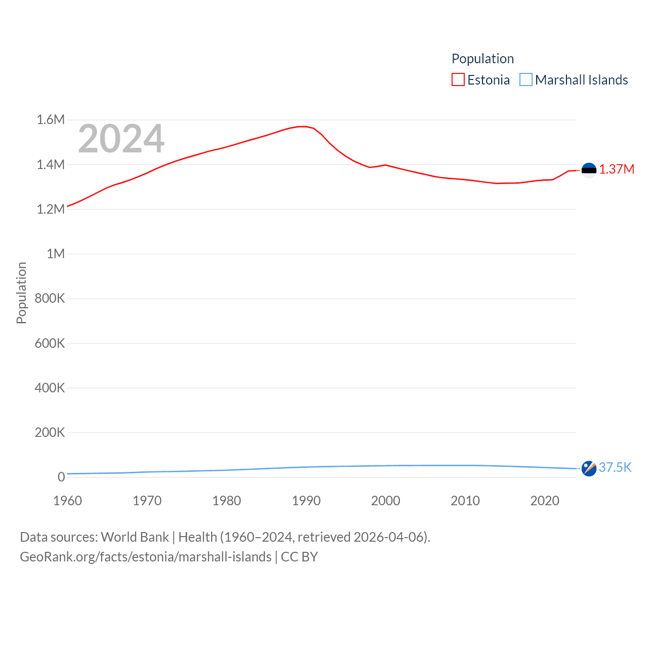 Estonia has a population of 1.37M (ranked 153/197), compared with 37.5K in The Marshall Islands (ranked 192/197). Estonia's land area is 16,498 sq mi versus 69.5 sq mi for The Marshall Islands (ranked 129th vs. 191st).