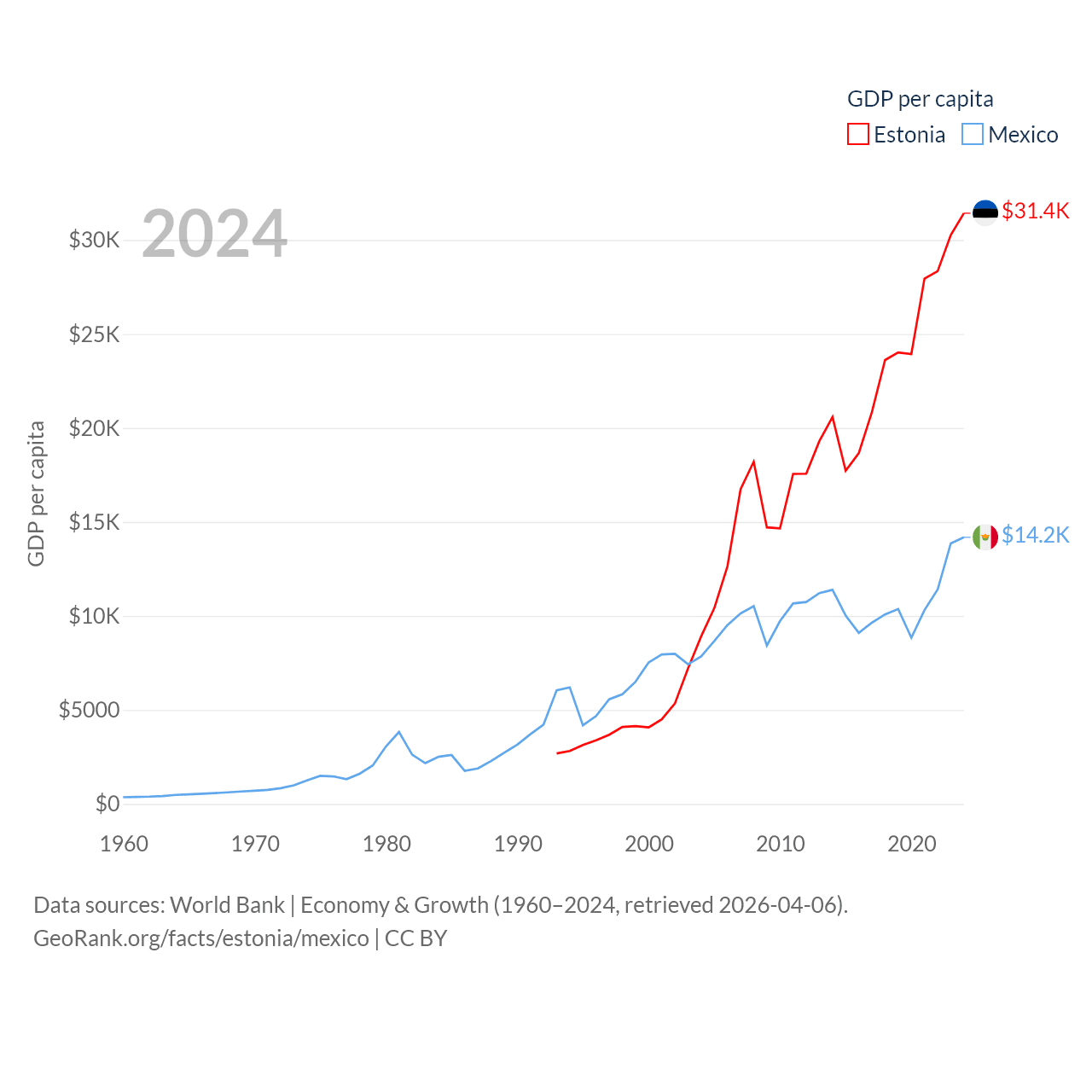 By GDP, Estonia ranks 100/197 ($43.1B) and Mexico ranks 13/197 ($1.86T). By GDP per capita, Estonia ranks 40/197 ($31,428), while Mexico ranks 69/197 ($14,186).