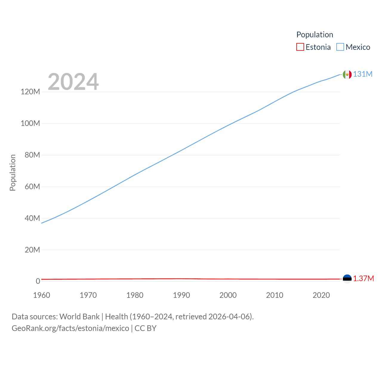 Estonia has a population of 1.37M (ranked 153/197), compared with 131M in Mexico (ranked 11/197). Estonia's land area is 16,498 sq mi versus 750,563 sq mi for Mexico (ranked 129th vs. 13th).