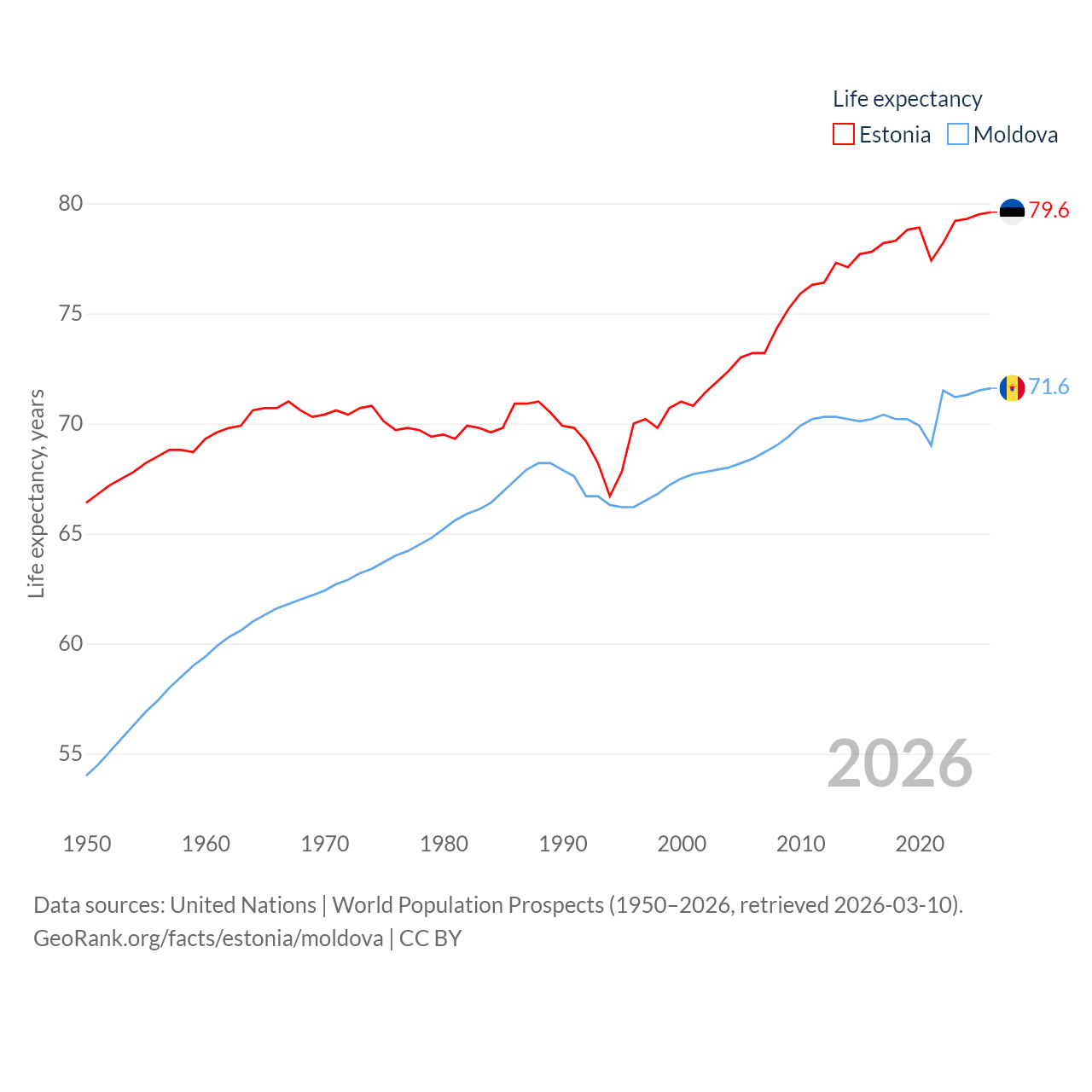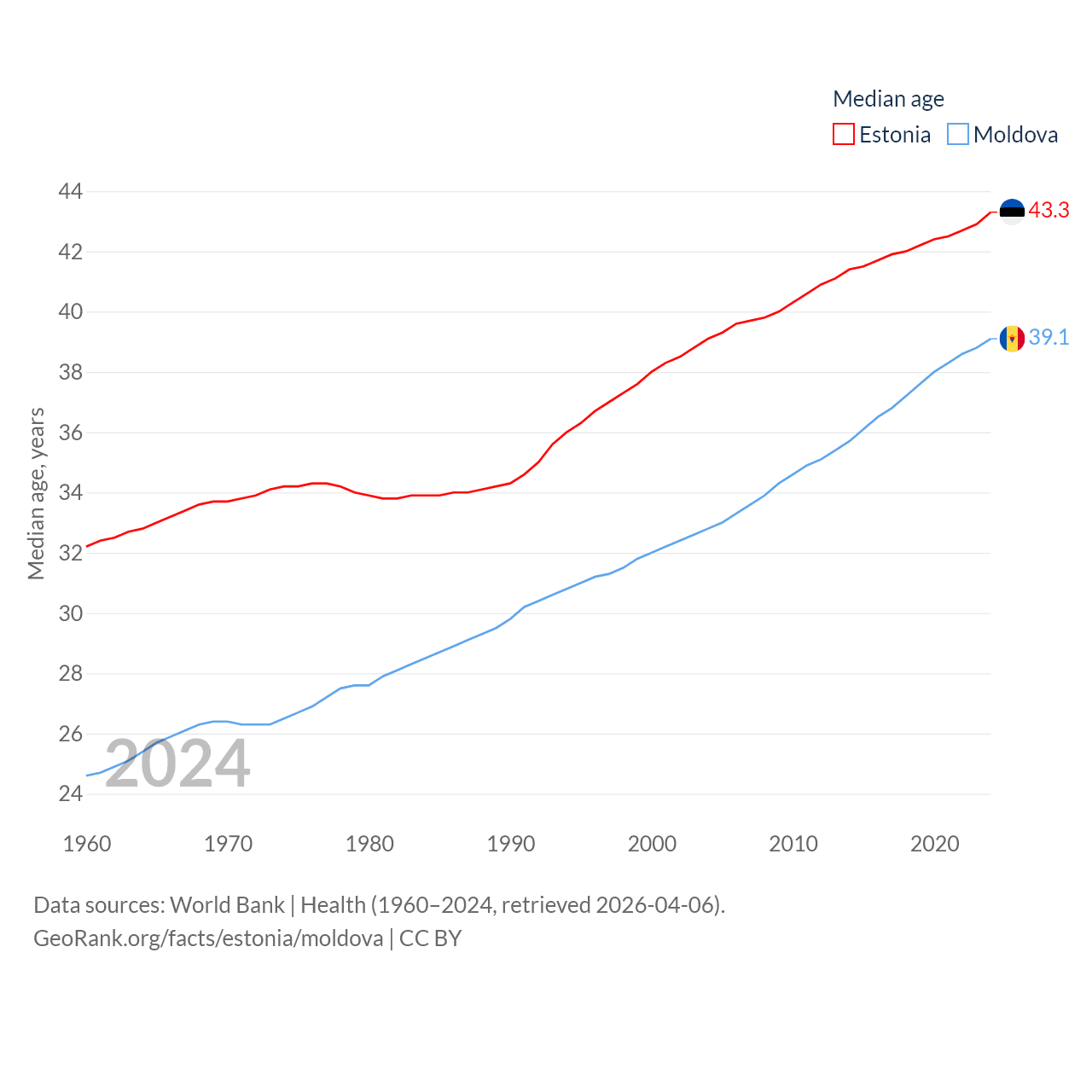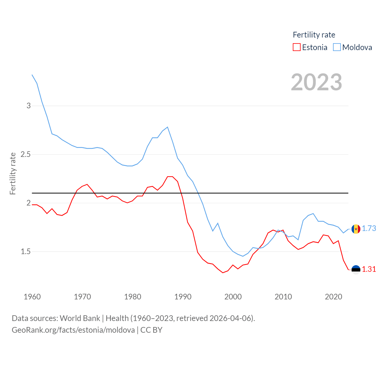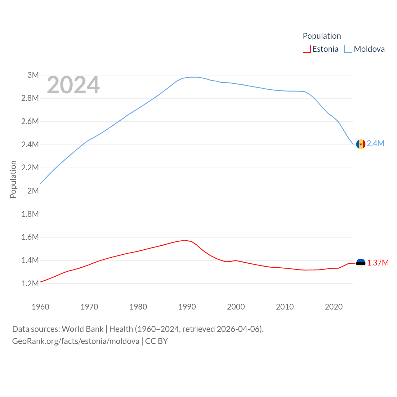 Estonia has a population of 1.37M (ranked 153/197), compared with 2.4M in Moldova (ranked 143/197). Estonia's land area is 16,498 sq mi versus 12,714 sq mi for Moldova (ranked 129th vs. 135th).