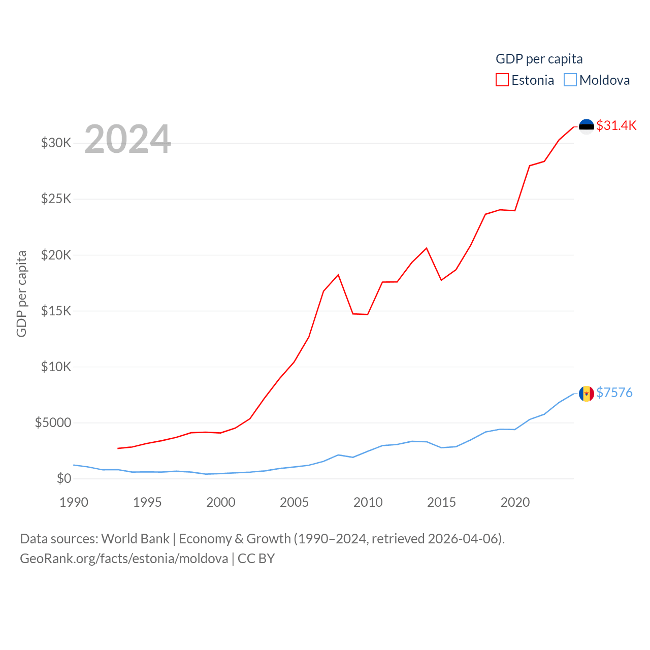 By GDP, Estonia ranks 100/197 ($43.1B) and Moldova ranks 134/197 ($18.2B). By GDP per capita, Estonia ranks 40/197 ($31,428), while Moldova ranks 99/197 ($7,576).