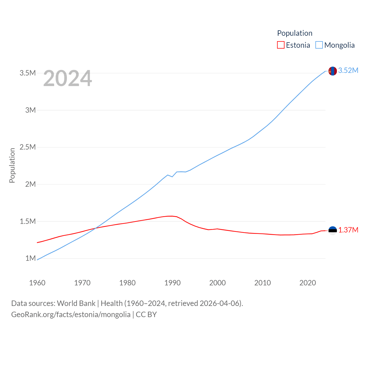 Estonia has a population of 1.37M (ranked 153/197), compared with 3.52M in Mongolia (ranked 132/197). Estonia's land area is 16,498 sq mi versus 601,740 sq mi for Mongolia (ranked 129th vs. 18th).