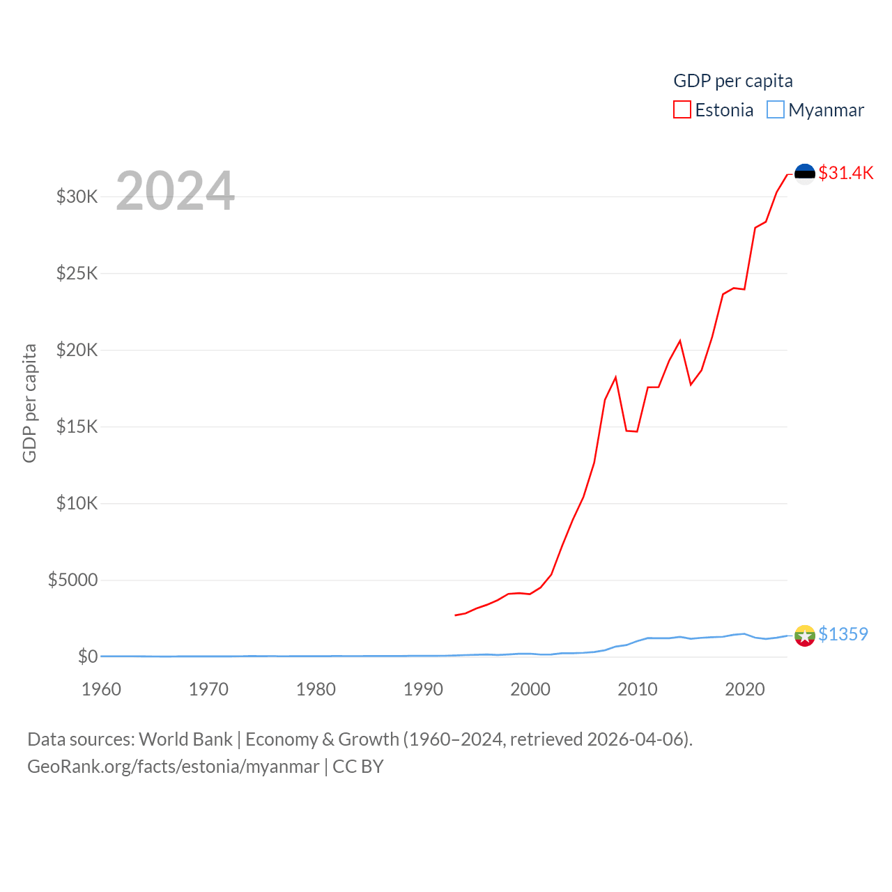 By GDP, Estonia ranks 100/197 ($43.1B) and Myanmar ranks 85/197 ($74.1B). By GDP per capita, Estonia ranks 40/197 ($31,428), while Myanmar ranks 165/197 ($1,359).