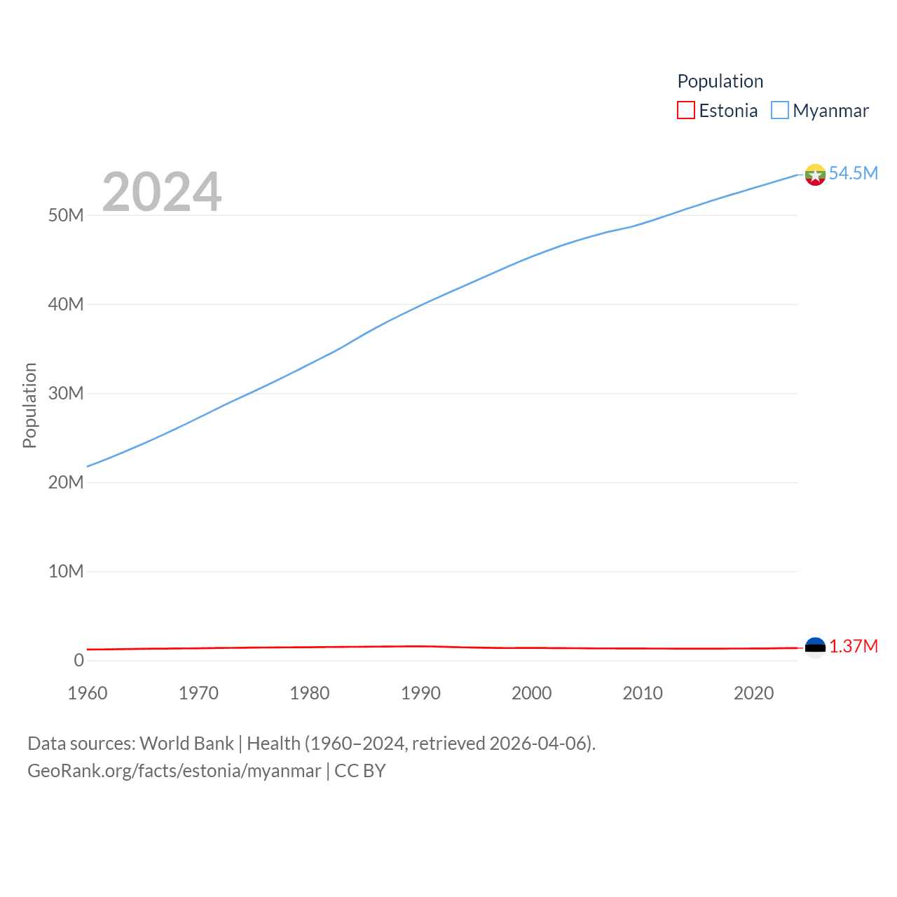 Estonia has a population of 1.37M (ranked 153/197), compared with 54.5M in Myanmar (ranked 27/197). Estonia's land area is 16,498 sq mi versus 251,997 sq mi for Myanmar (ranked 129th vs. 39th).