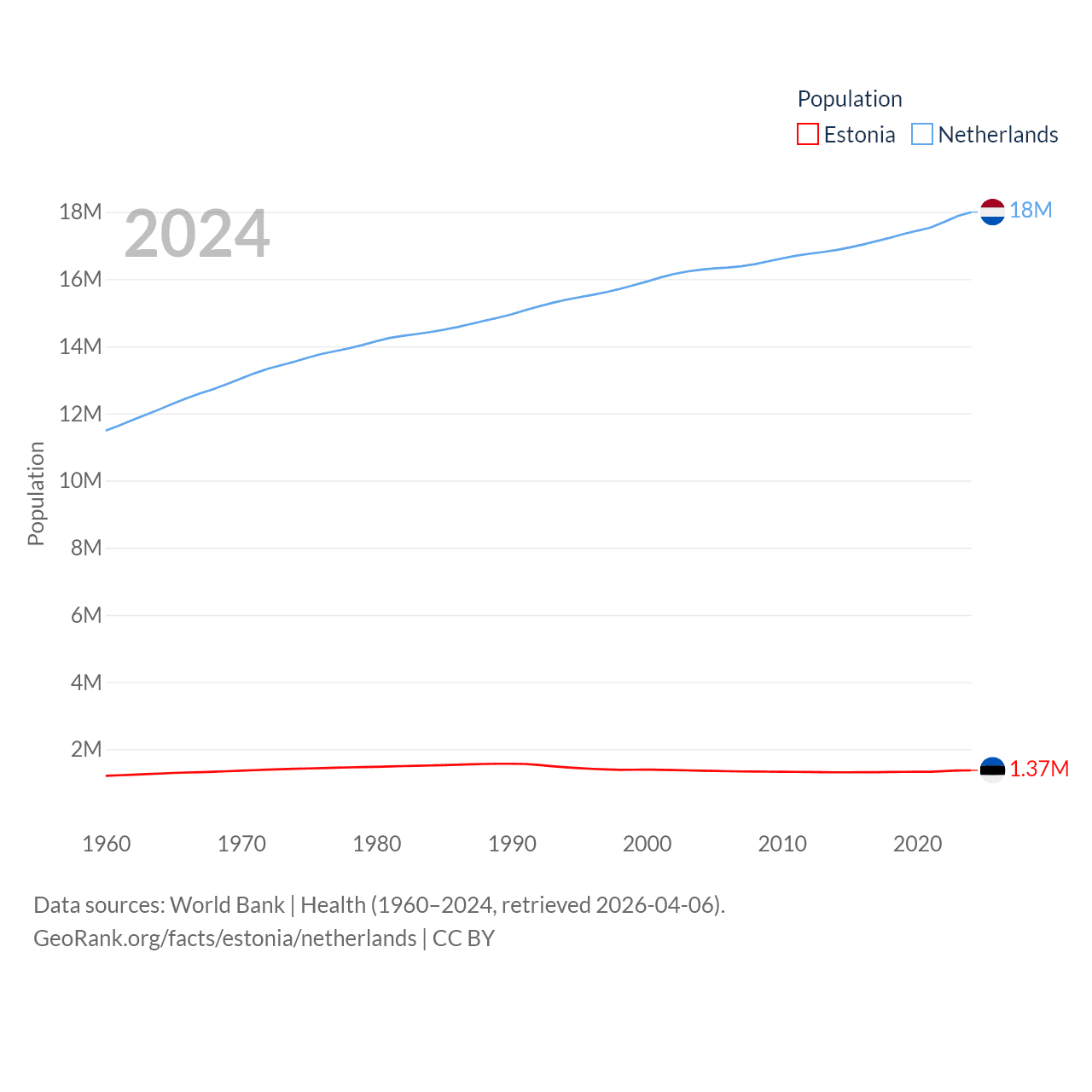 Estonia has a population of 1.37M (ranked 153/197), compared with 18M in The Netherlands (ranked 72/197). Estonia's land area is 16,498 sq mi versus 13,000 sq mi for The Netherlands (ranked 129th vs. 134th).