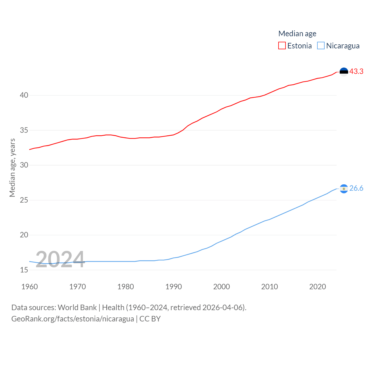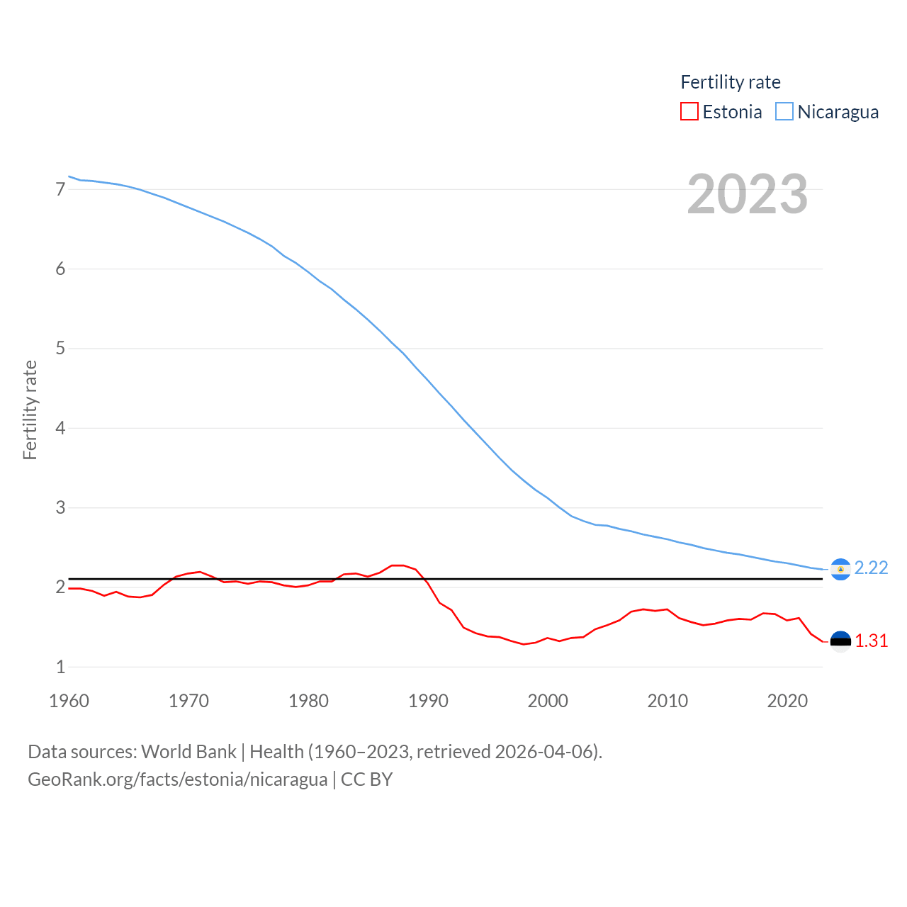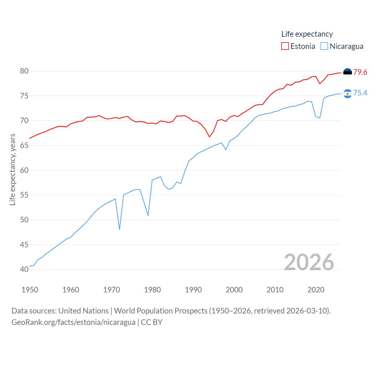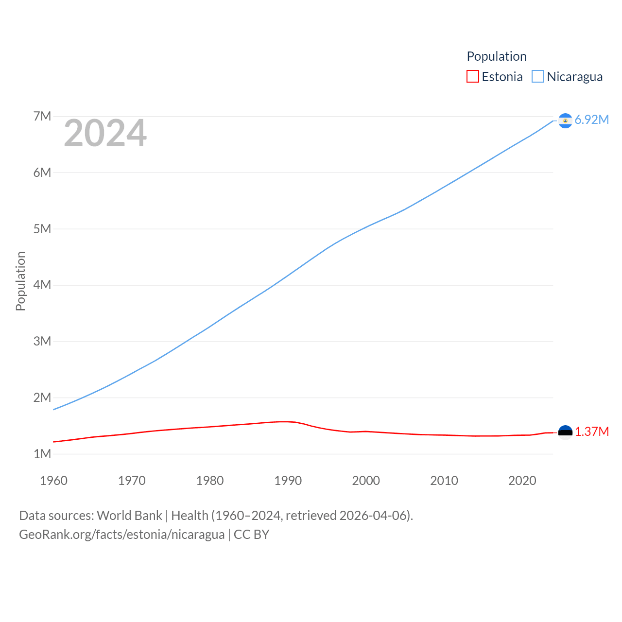 Estonia has a population of 1.37M (ranked 153/197), compared with 6.92M in Nicaragua (ranked 108/197). Estonia's land area is 16,498 sq mi versus 46,464 sq mi for Nicaragua (ranked 129th vs. 98th).