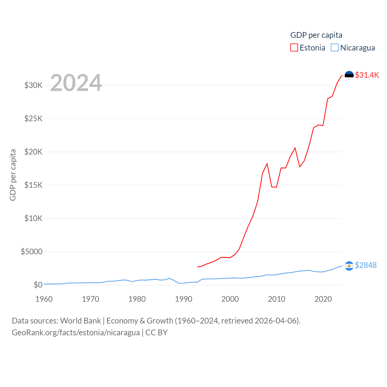 By GDP, Estonia ranks 100/197 ($43.1B) and Nicaragua ranks 131/197 ($19.7B). By GDP per capita, Estonia ranks 40/197 ($31,428), while Nicaragua ranks 141/197 ($2,848).