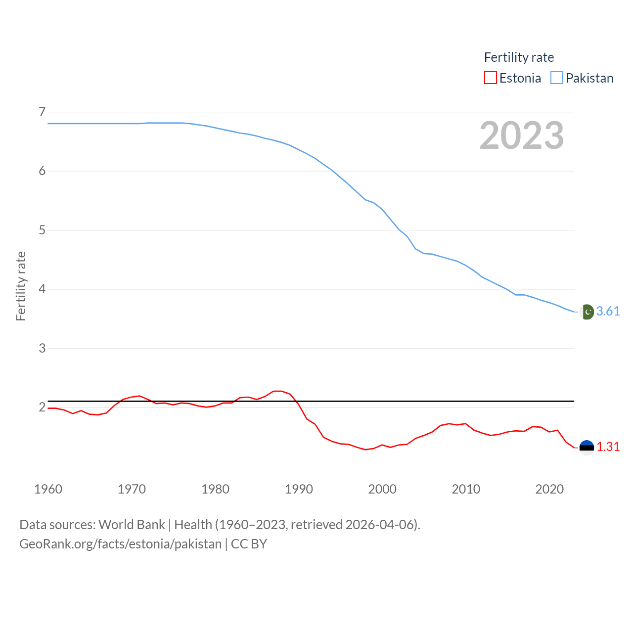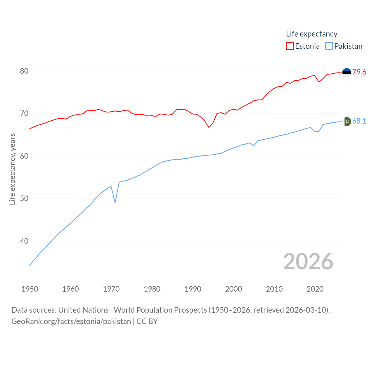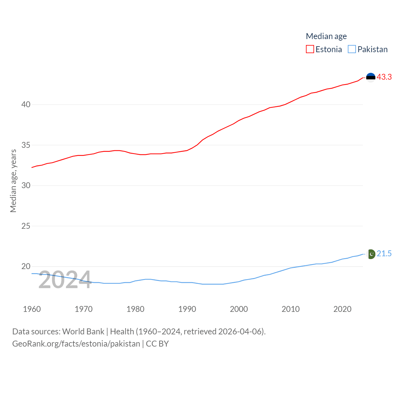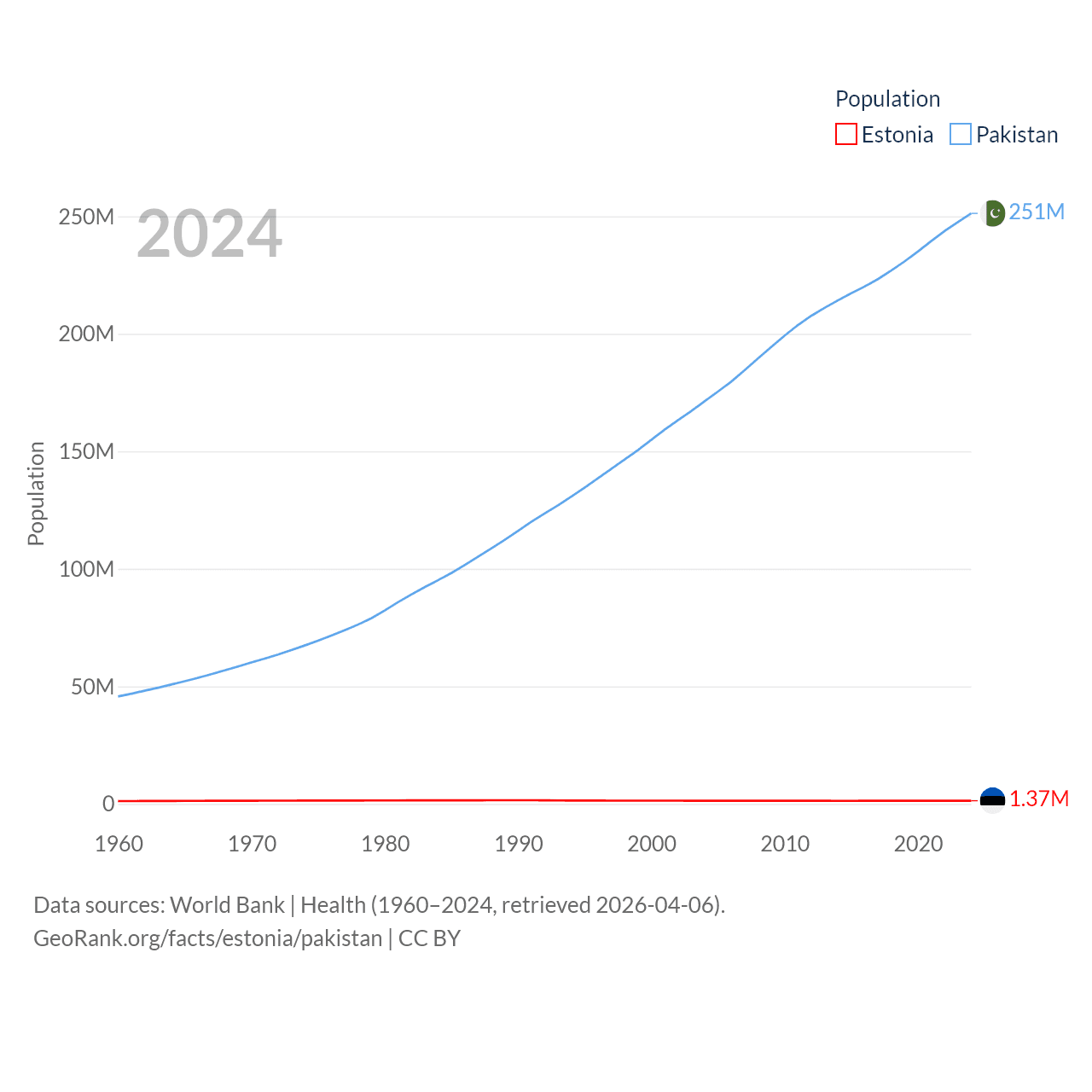 Estonia has a population of 1.37M (ranked 153/197), compared with 251M in Pakistan (ranked 5/197). Estonia's land area is 16,498 sq mi versus 297,638 sq mi for Pakistan (ranked 129th vs. 35th).