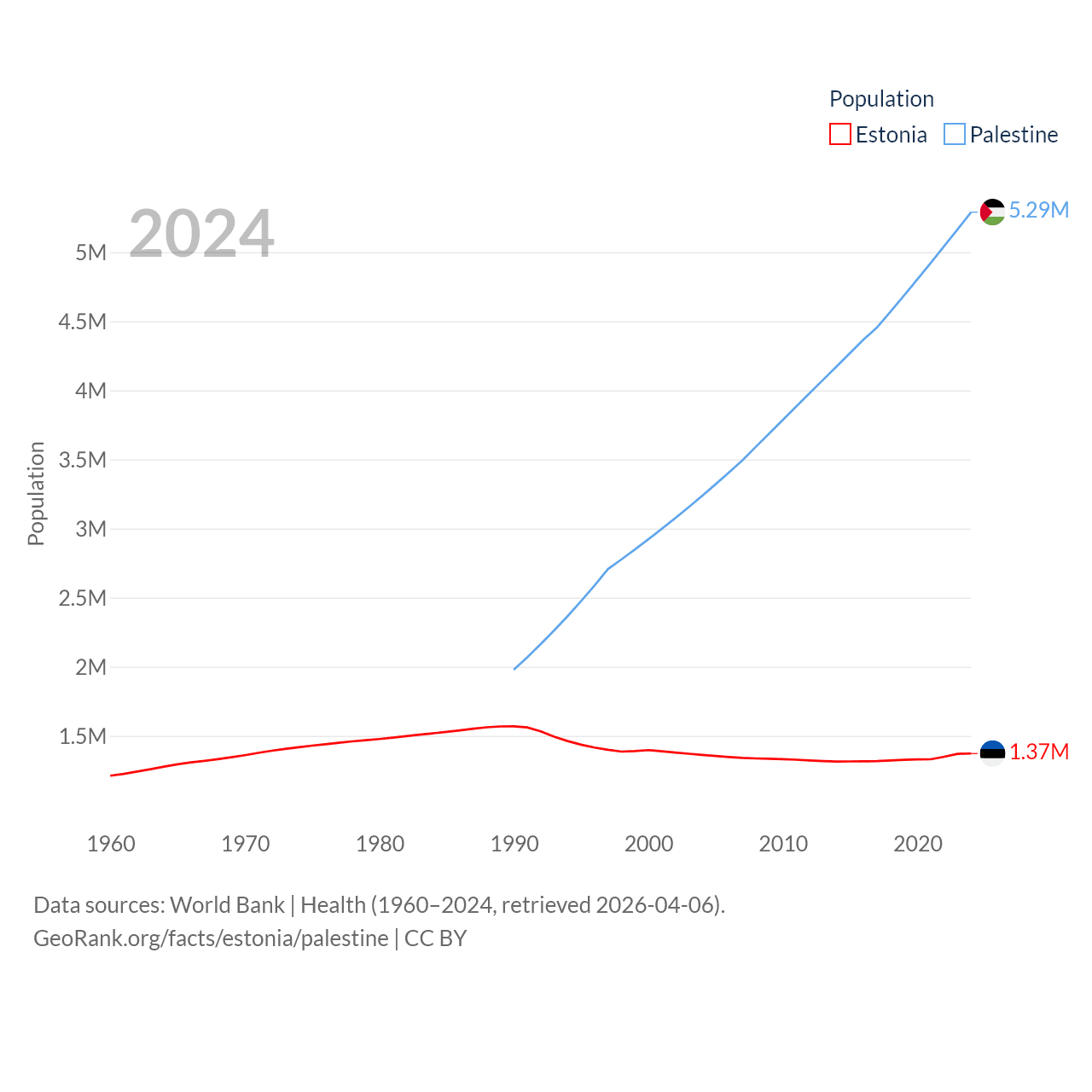 Estonia has a population of 1.37M (ranked 153/197), compared with 5.29M in Palestine (ranked 122/197). Estonia's land area is 16,498 sq mi versus 2,326 sq mi for Palestine (ranked 129th vs. 164th).
