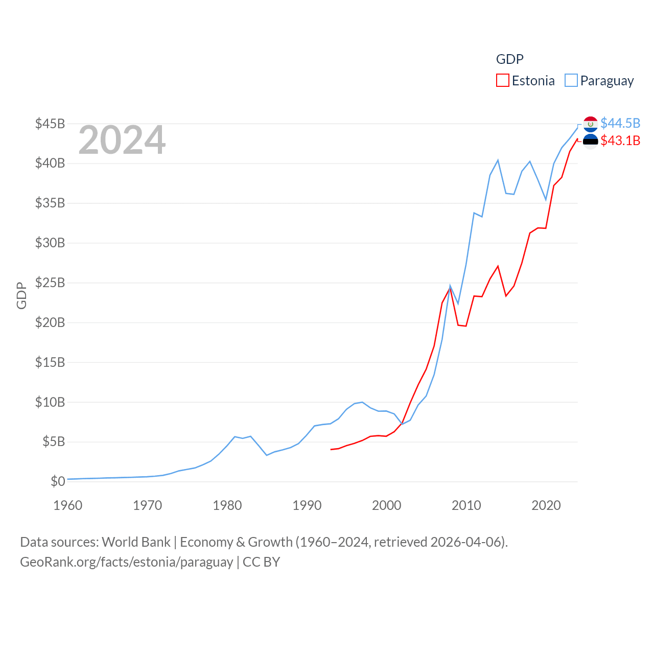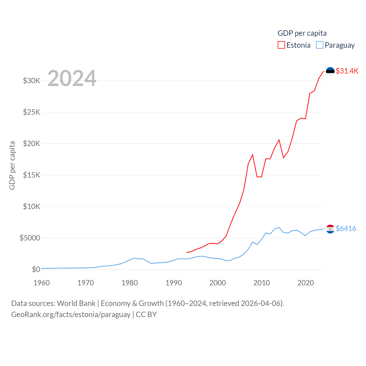 By GDP, Estonia ranks 100/197 ($43.1B) and Paraguay ranks 98/197 ($44.5B). By GDP per capita, Estonia ranks 40/197 ($31,428), while Paraguay ranks 109/197 ($6,416).