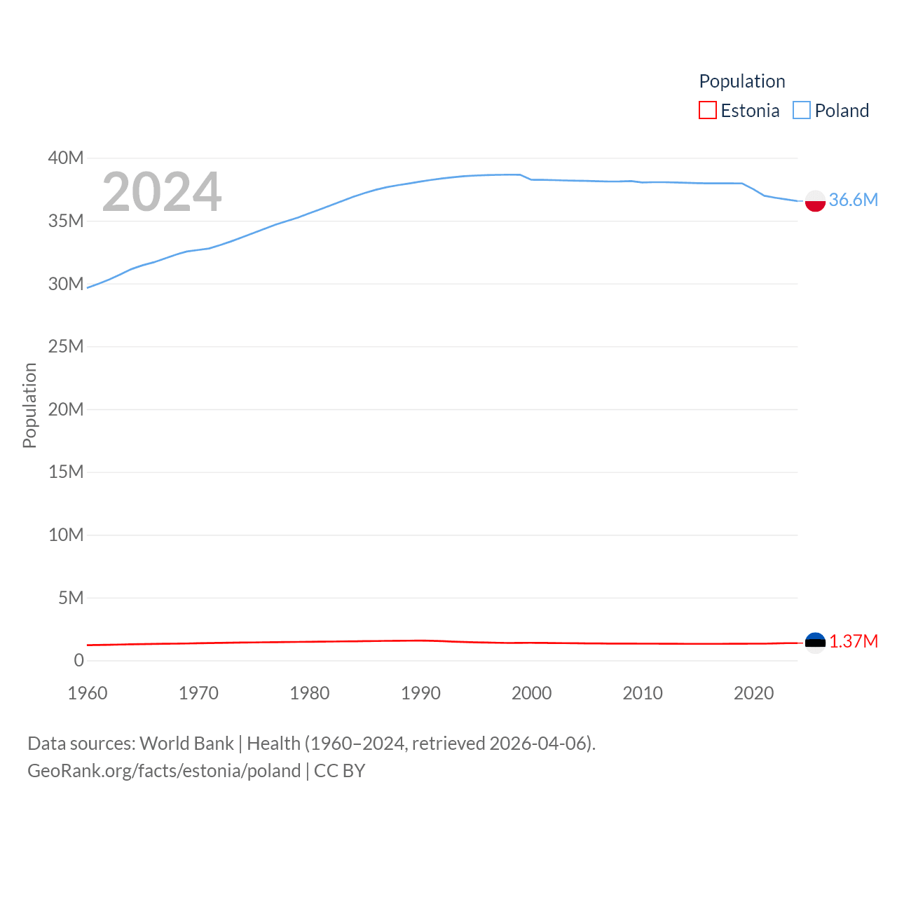 Estonia has a population of 1.37M (ranked 153/197), compared with 36.6M in Poland (ranked 42/197). Estonia's land area is 16,498 sq mi versus 118,252 sq mi for Poland (ranked 129th vs. 69th).