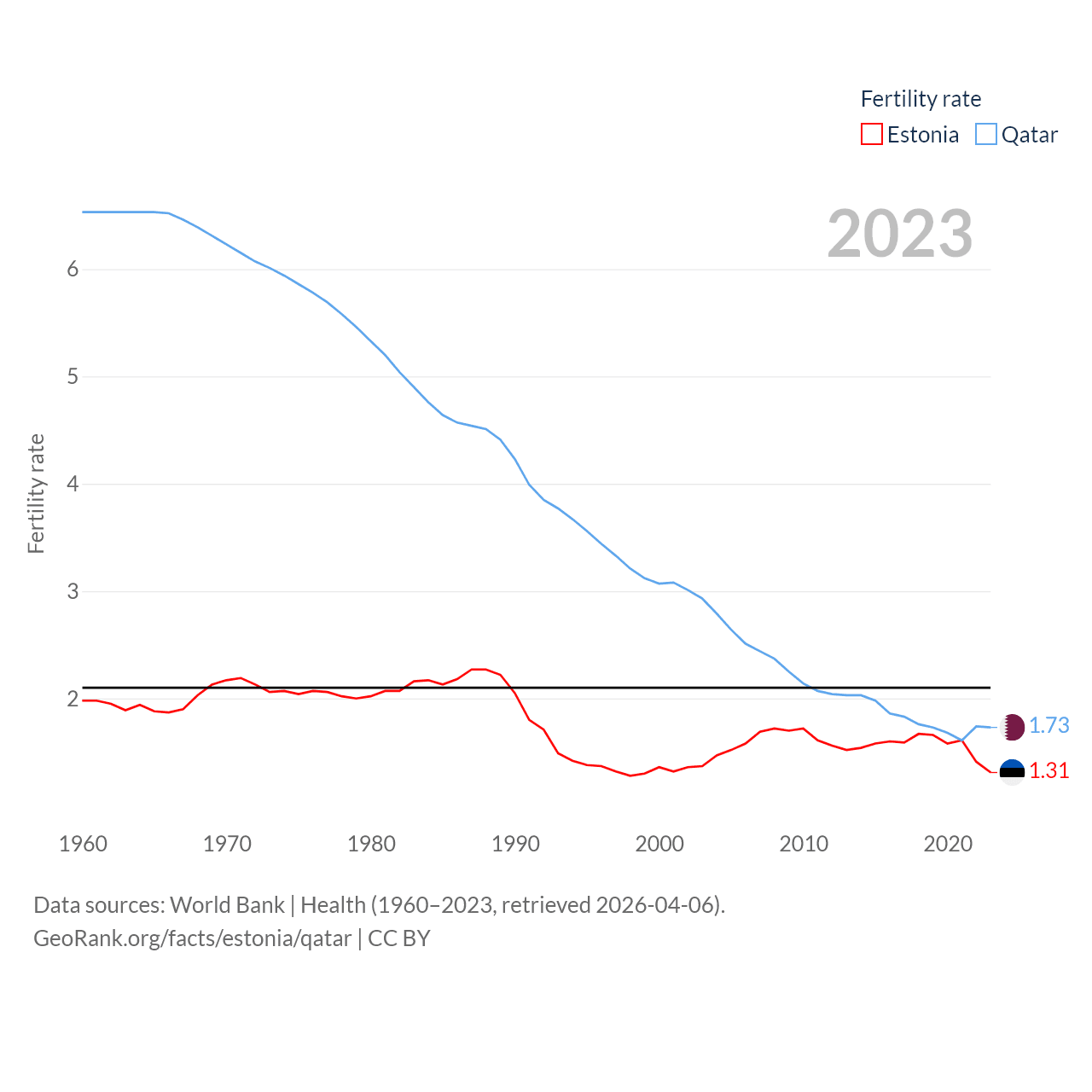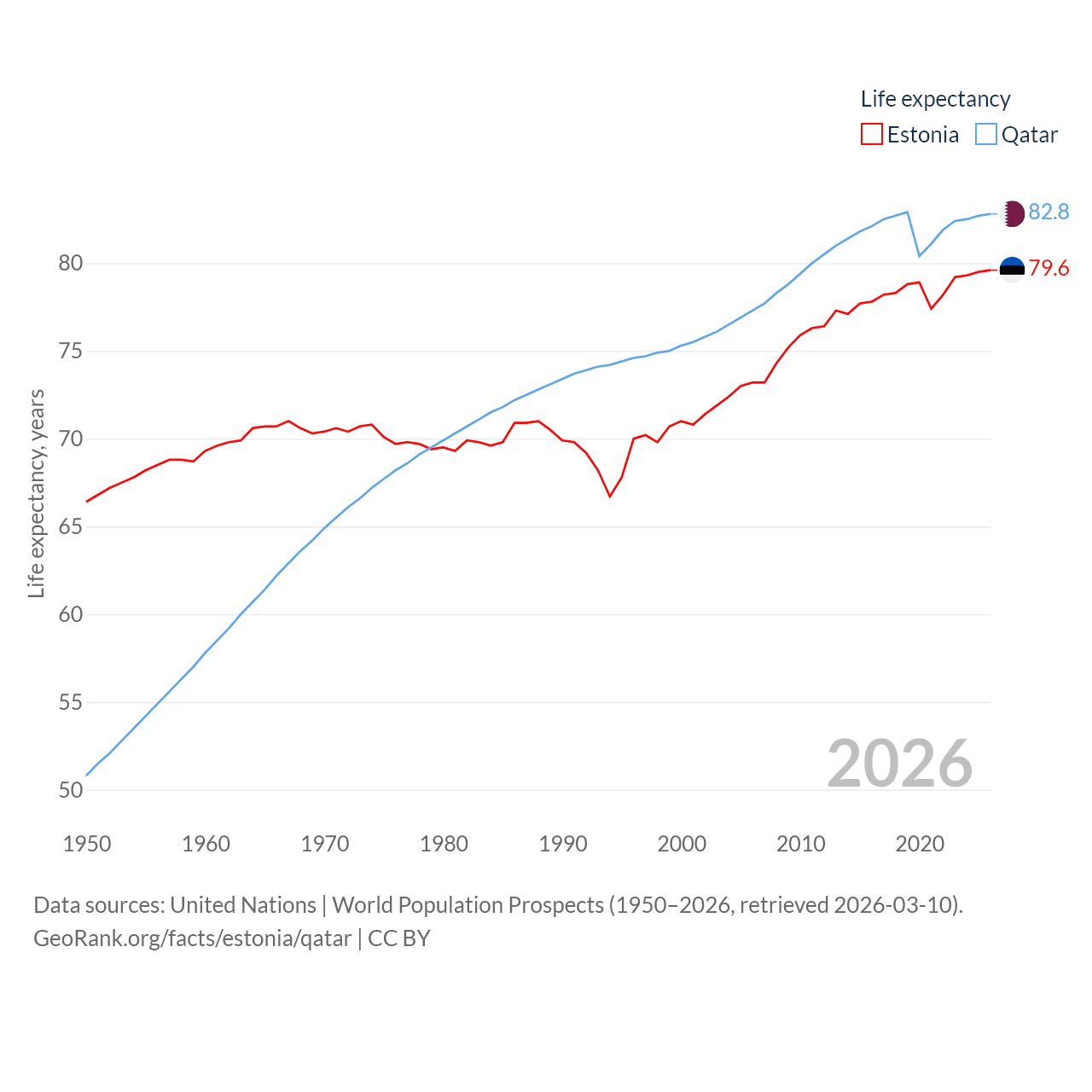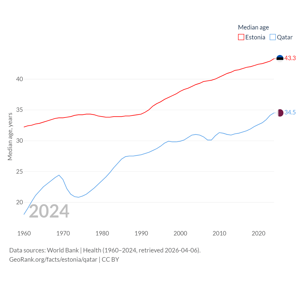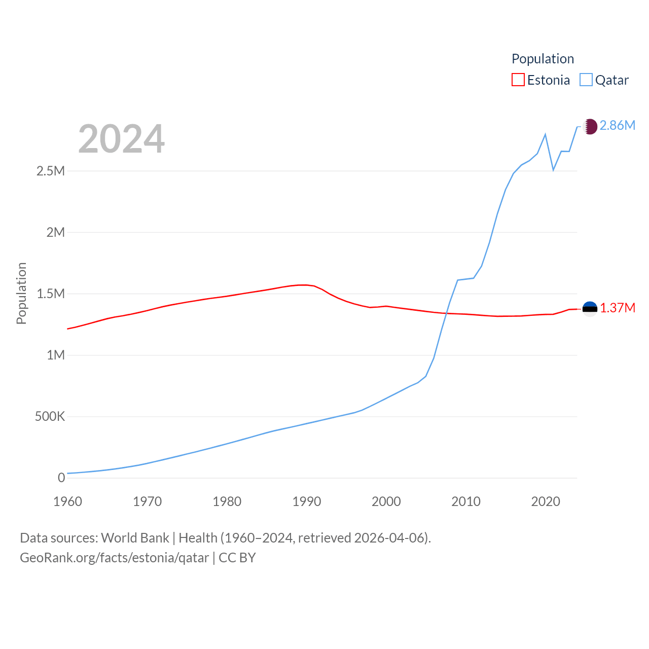 Estonia has a population of 1.37M (ranked 153/197), compared with 2.86M in Qatar (ranked 138/197). Estonia's land area is 16,498 sq mi versus 4,436 sq mi for Qatar (ranked 129th vs. 158th).